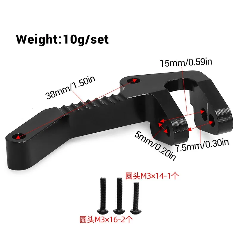 This black aluminum alloy Panhard rod mount and anti-roll bar set designed for 1/10 scale Traxxas TRX-4 and TRX-6 (T4) models weighing 10 grams offers durability and precise performance. Compatible with Ford Bronco and Chevrolet configurations, it features a complex, rugged design with textured ridges on its horizontal section, rounded attachment extension, large mounting hole, and an open slot for flexible attachment. The component’s utilitarian style emphasizes strength and accuracy for off-road RC vehicle customization. Ideal for users 14 and older, this premium part enhances suspension stability, ensuring a reliable upgrade for your RC truck.