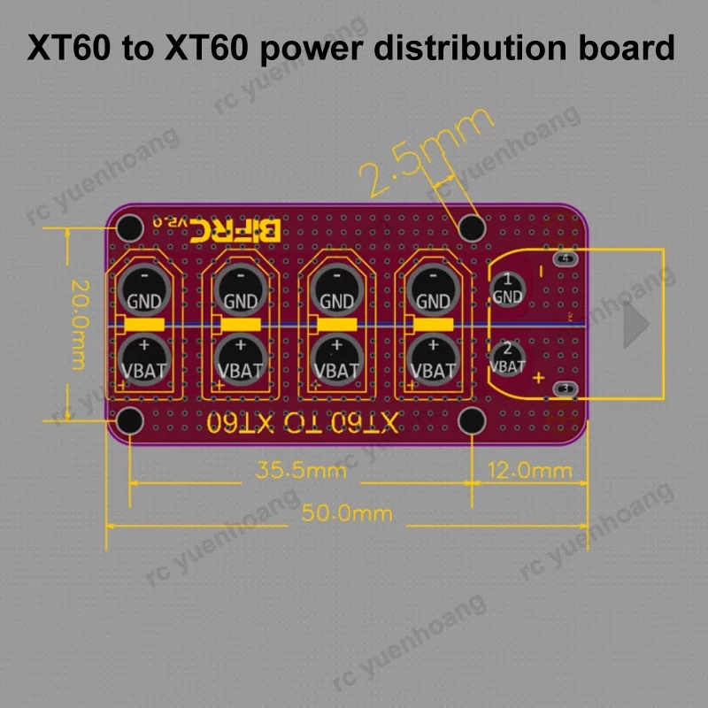 Experience reliable power management with this high-performance YUENHOANG power distribution board designed for RC boats, submarines, and cars. Measuring approximately 50mm in length, this sleek black PCB features four robust yellow XT60 connectors for input and output, providing seamless connections for high-current applications up to 200A. Its solid construction ensures durability while maintaining low resistance for optimal electrical efficiency. Whether you choose the version with or without the yellow plastic base shell, this board enhances the safety and organization of your RC models. Easy to integrate and built for performance, it is the ideal component to ensure your remote control vehicles operate smoothly and safely, giving you confidence in your hobby projects.