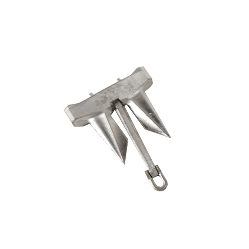 - Features detailed design with rectangular shank, ridges, tapered conical flukes, and small rings for attachment.