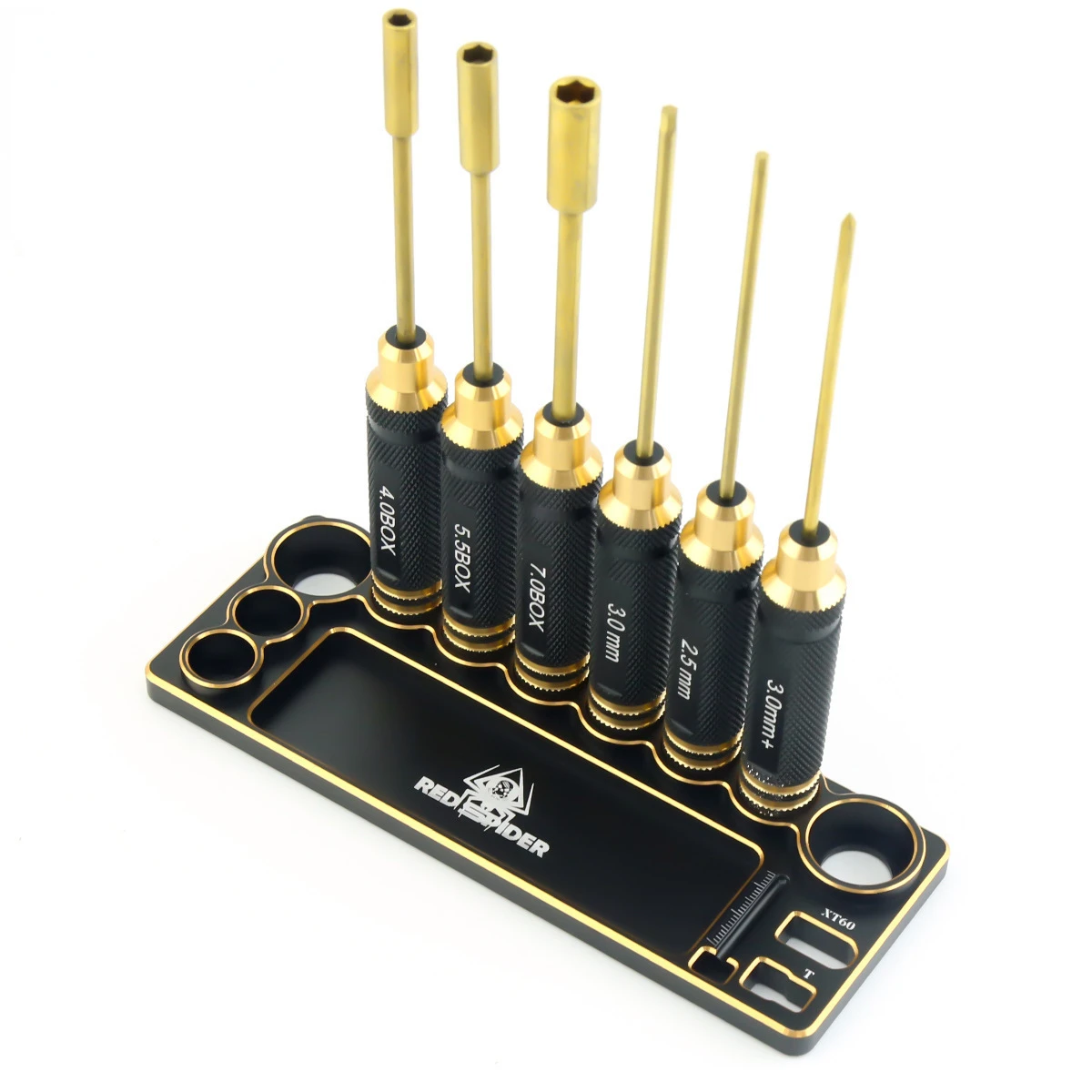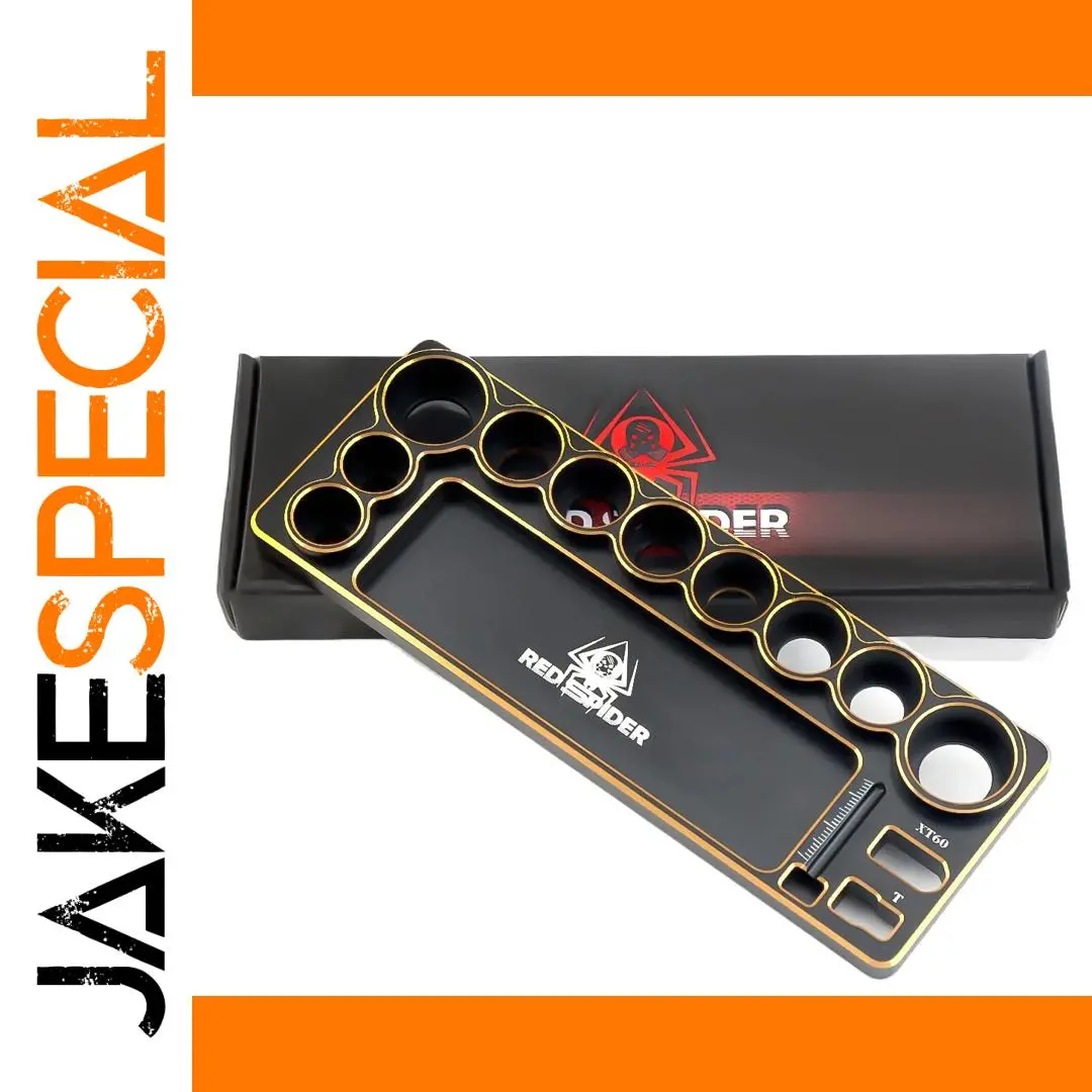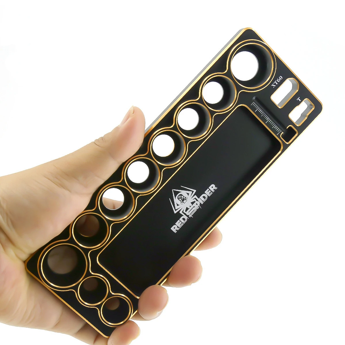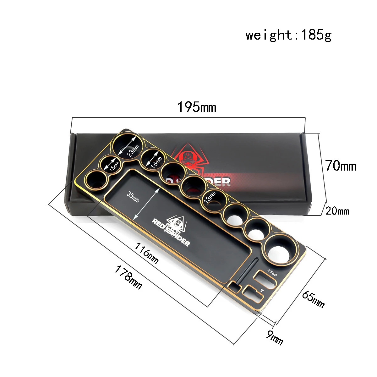 The CNC aluminum multi-function screwdriver wrench storage rack is a sleek, durable tool organizer designed for RC car and boat enthusiasts. Measuring 178mm by 65mm and weighing 185 grams, it features multiple tool ports bordered with elegant gold accents, providing a stylish and practical solution for organizing screwdrivers, screws, shock caps, and welding T Plug and XT60 connectors. Crafted from sturdy black-coated aluminum, this high-quality stand combines refined aesthetics with durability, making maintenance and assembly tasks more efficient. Its compact, minimalist design includes a measurement scale and handle cutout, ensuring easy handling and versatile functionality for those passionate about RC hobbies and precision work.