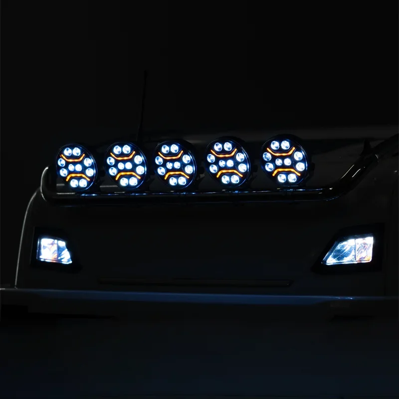Experience a realistic upgrade for your 1/14 scale Tamiya RC truck with this premium LED roof spotlight kit. The sleek black ABS plastic housings add a modern touch, while the transparent covers protect bright, high-intensity LEDs inside. Designed to fit models like SCANIA 770S R620, FH16XL 750, Arocs, and MAN TGX, these four circular lights create a clean, symmetrical pattern that enhances nighttime realism. The kit offers multi-mode control and dual-color options—white, orange, or red—bringing dynamic lighting effects to your model. Easy to install with direct metal connector attachments, this set refines your RC truck’s appearance and performance. Durable and reliable, it’s perfect for custom enthusiasts aiming for authentic detailing.