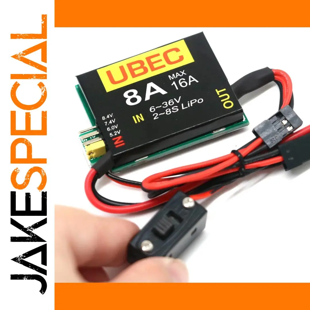 - The single-output UBEC handles 6-36V input, with adjustable outputs from 5.2V to 8.4V, delivering continuous 8A and peak 16A power for versatile RC applications.
