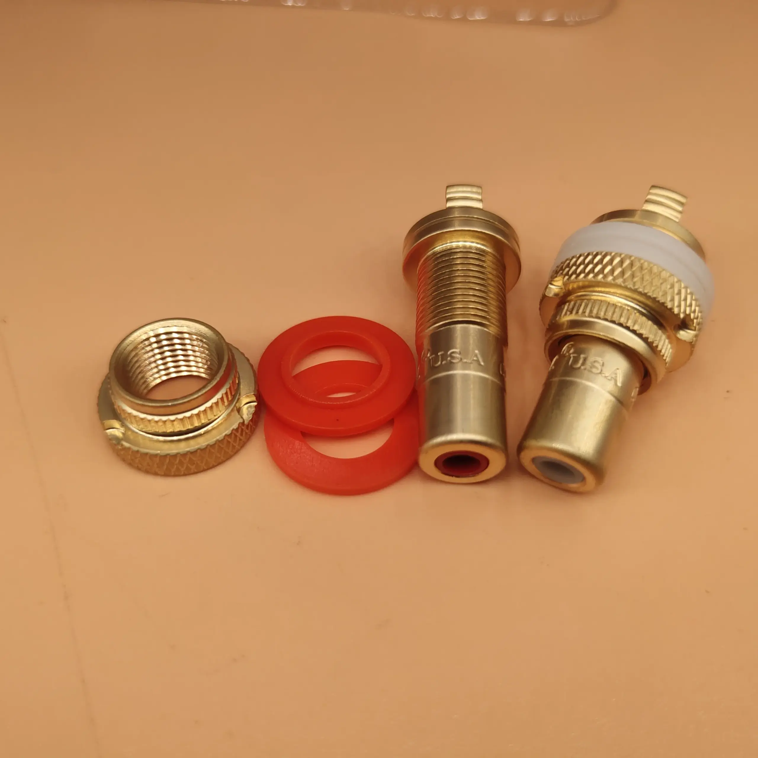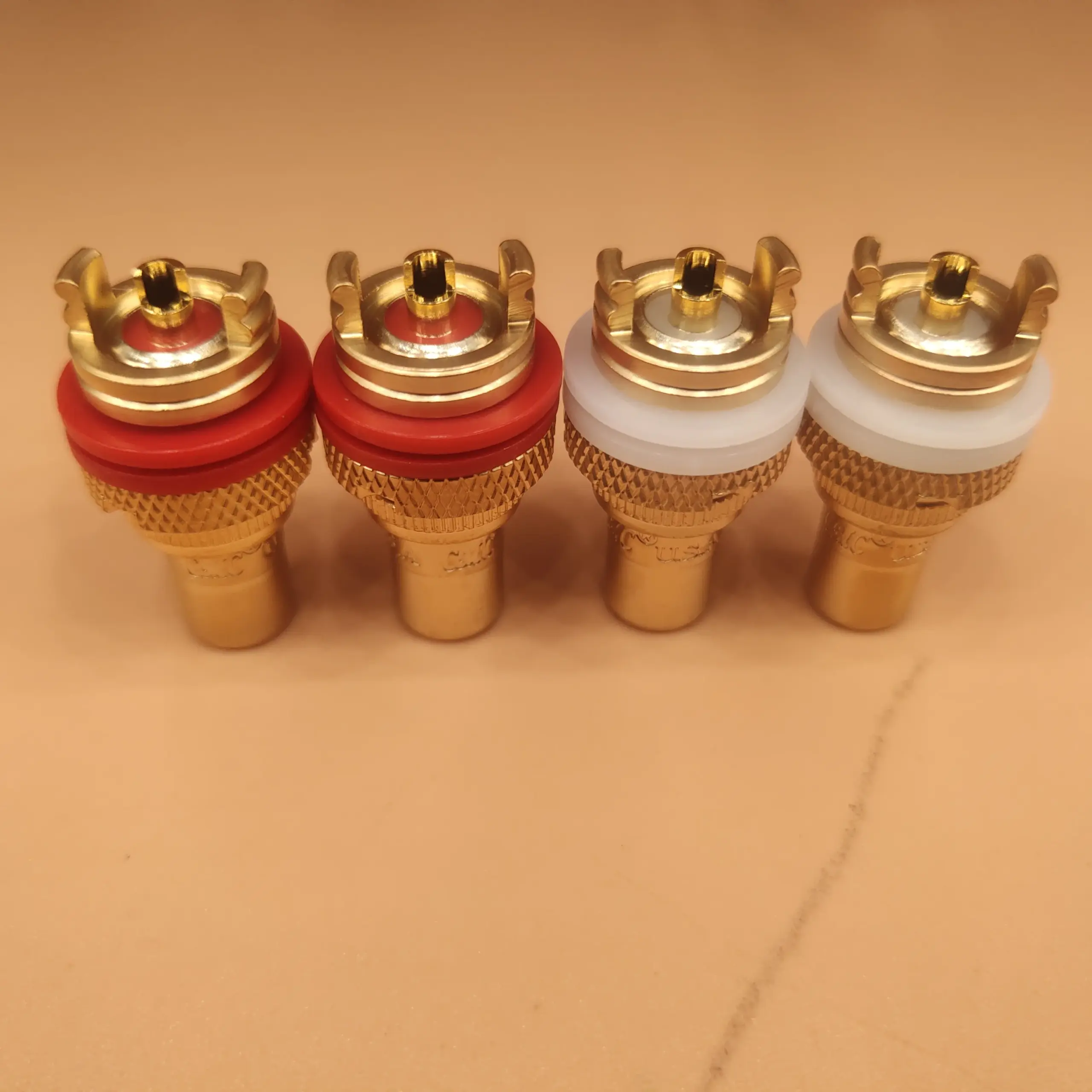 Experience superior audio performance with the RCA Female Jack Plug Connectors. Crafted from copper, these connectors feature a sleek cylindrical design with a bright gold finish for enhanced conductivity and aesthetic appeal. The color-coded bases—white for left and red for right audio channels—ensure easy identification during setup. Each connector measures approximately 32mm in length and weighs around 14.5g, making them compact and easy to handle. Designed for seamless integration into audio and video systems, this bundle includes 8 pieces, perfect for your audio cable needs. Enjoy a reliable connection that elevates your sound experience.
