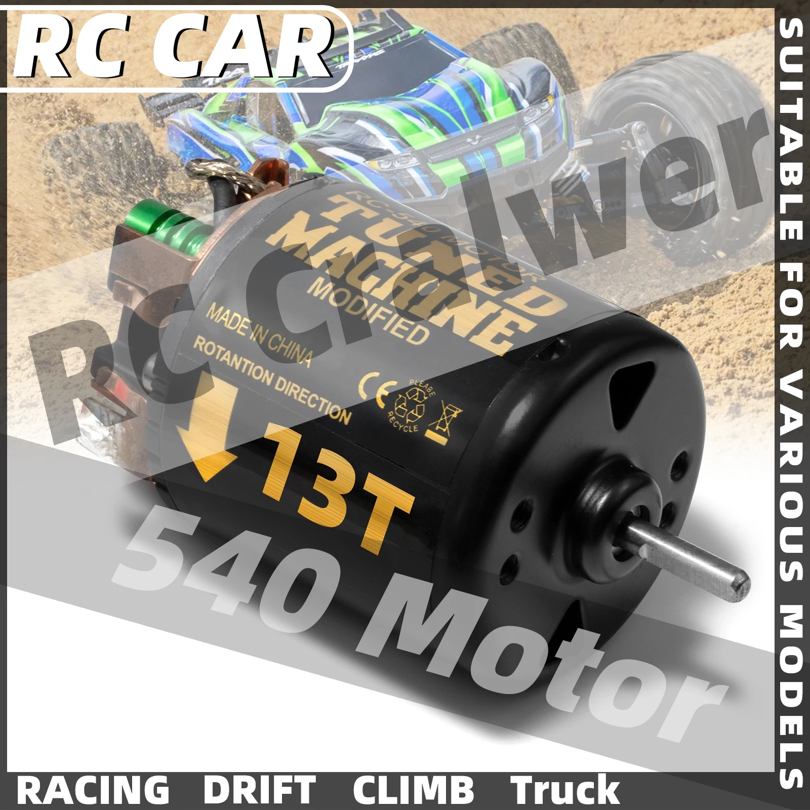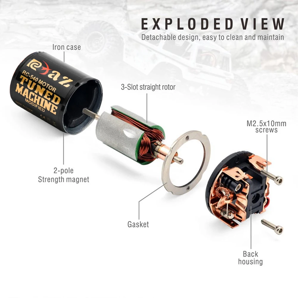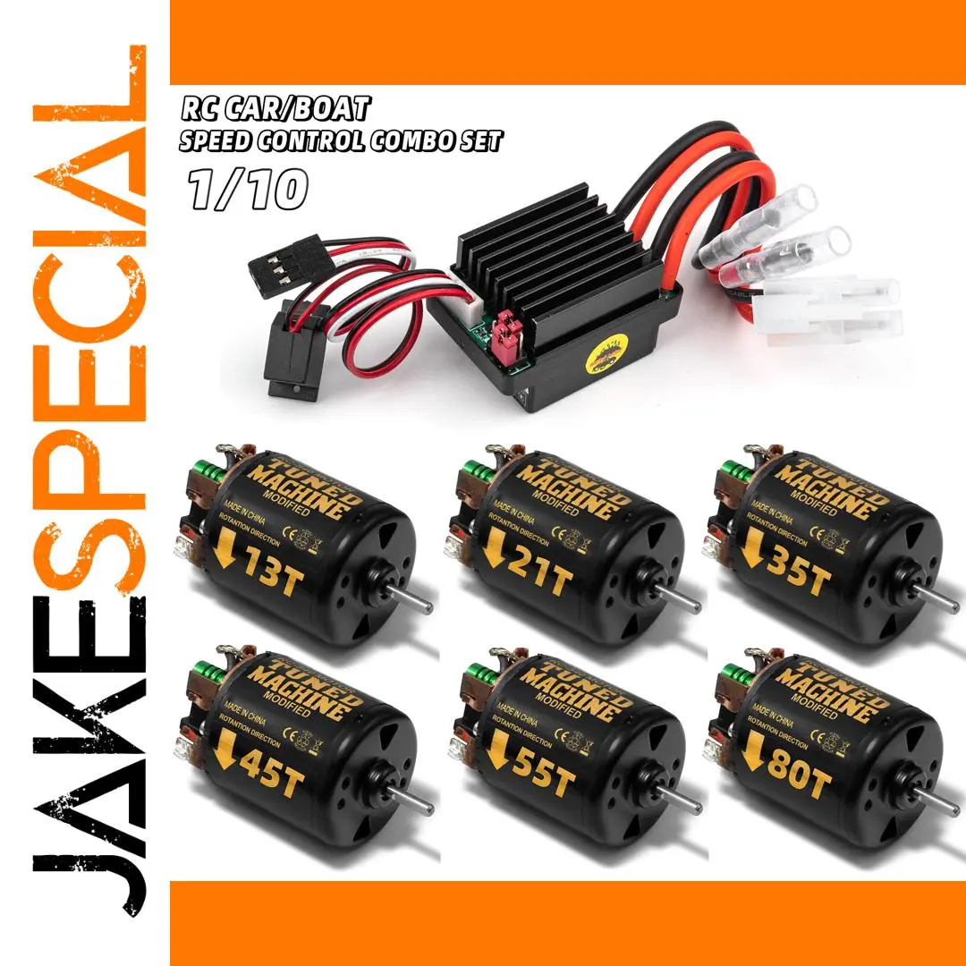 This RCXAZ 540 Brushed Motor and ESC combination set is meticulously designed for remote control enthusiasts. The robust black ESC boasts cooling efficiency with its heat sink, while the five RC motors showcase striking yellow lettering. From 13T to 80T, these motors cater to various performance needs, ensuring a perfect fit for your 1/10 RC crawler or boat. The green and black mounting brackets not only secure components but also deliver an aesthetic touch. With a focus on durability and superior performance, this set transforms your RC vehicles, allowing you to tackle hills and drift through corners with ease. Experience the thrill of control and speed as you enhance your collection.