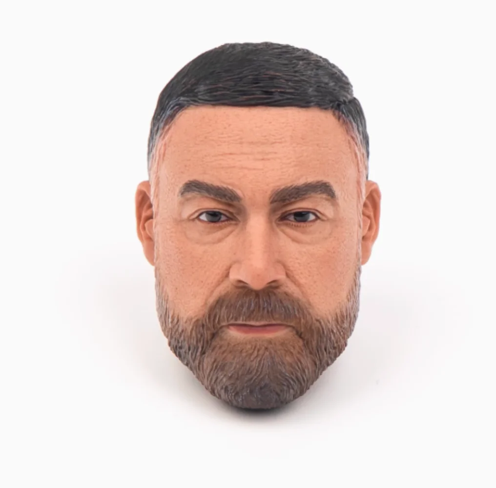 Imagine adding an authentic touch to your 12-inch action figures with this meticulously crafted soldier head sculpt. Designed for collectors who appreciate realistic details, this model features a natural skin tone with subtle textures that mimic lifelike facial features and skin pores. The short, dark brown hair is neatly combed and textured, complementing the serious expression conveyed by bold, defined eyebrows and deep-set painted irises. The facial features include a straight nose and neutral lips, enhanced with a meticulously sculpted full beard and mustache in shades of brown, complete with individual hairs for added realism. Fine wrinkles around the forehead and eyes give it a highly lifelike, expressive look, making your collectible figure more compelling and authentic.