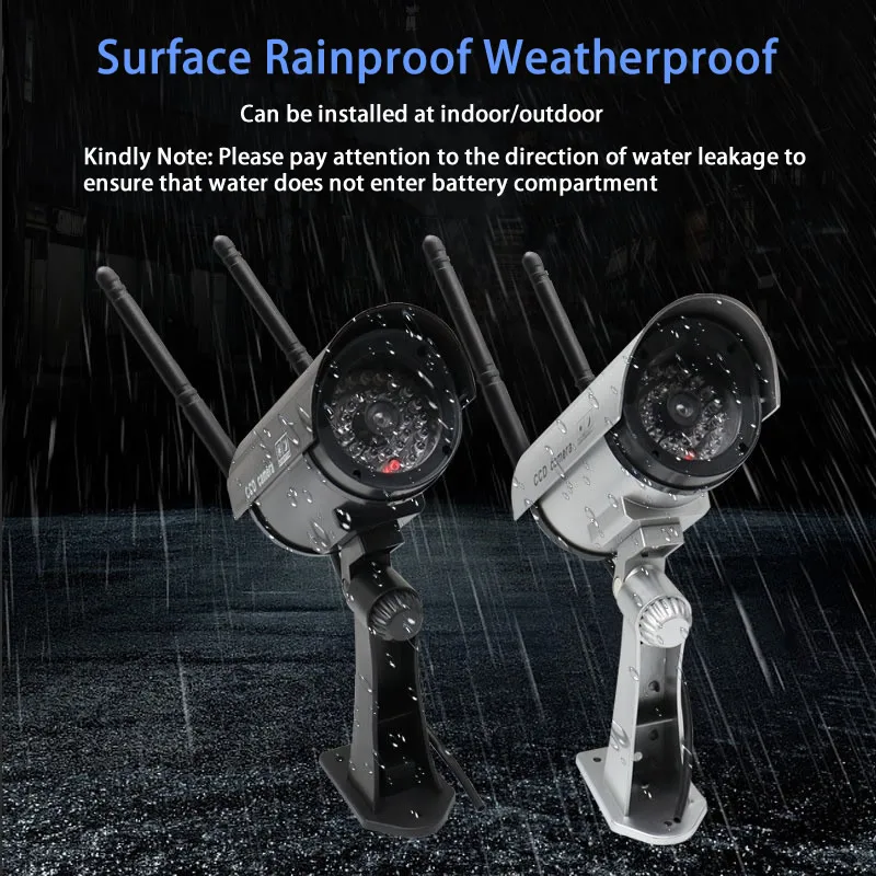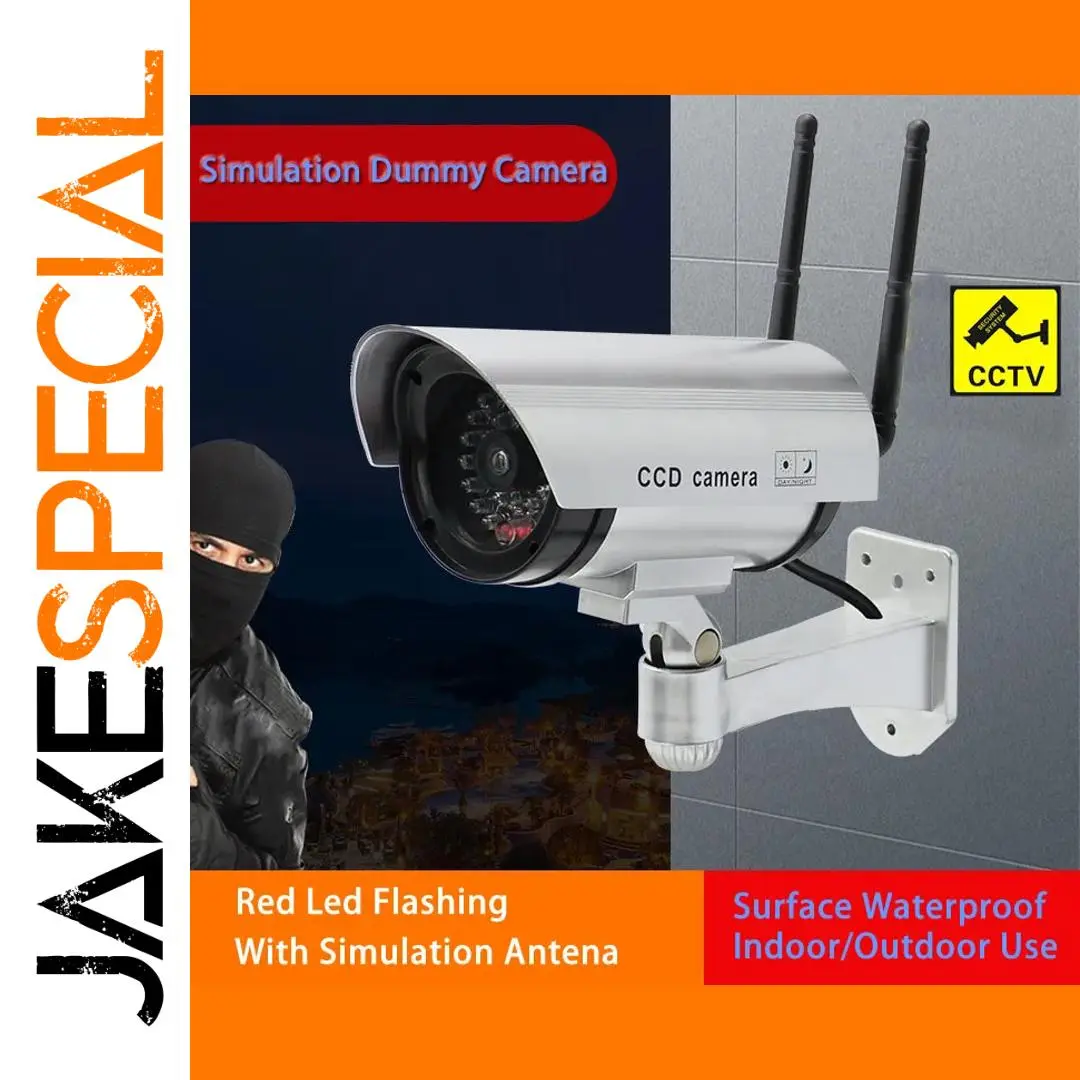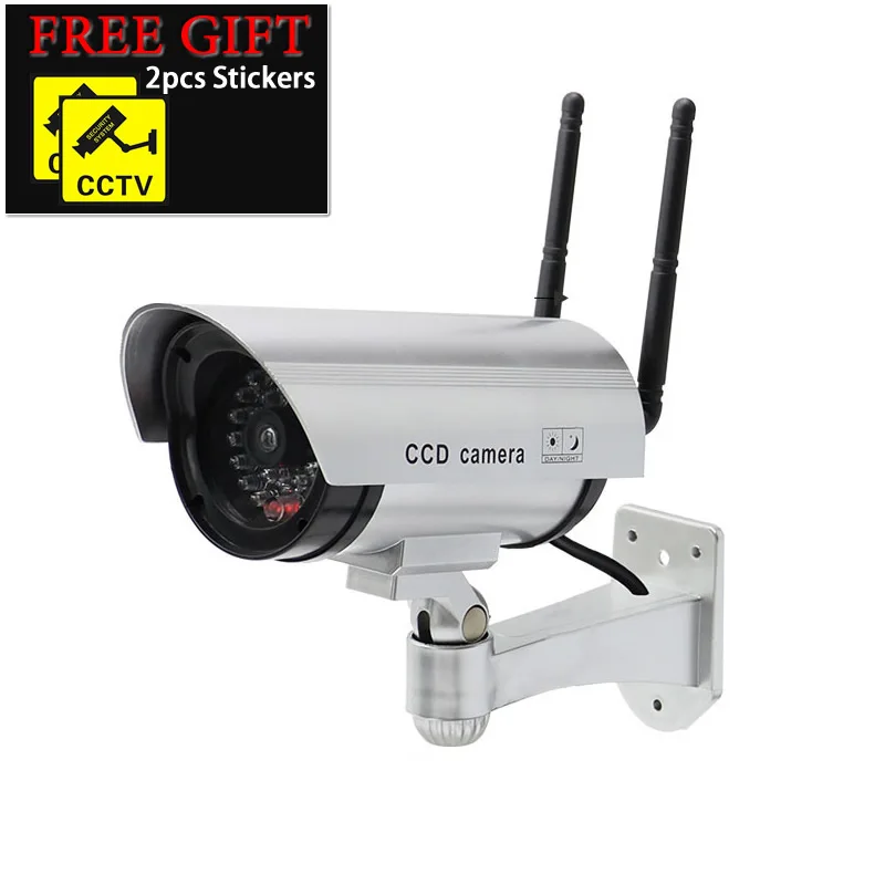 This realistic-looking dummy wireless CCTV camera features a cylindrical plastic body available in black or silver, designed for indoor and outdoor use. It measures the same size as a real camera and is equipped with a flashing red LED to simulate active surveillance, effectively deterring theft or robbery. The camera includes two simulation antennas for enhanced authenticity and is wall-mountable with screws included for easy installation. Powered by 2 AA batteries (not included), its sleek design features horizontal grooves along the sides and a prominent front lens area. Perfect for enhancing security aesthetics in any home, office, or commercial space, it offers a cost-effective way to create a secure environment.