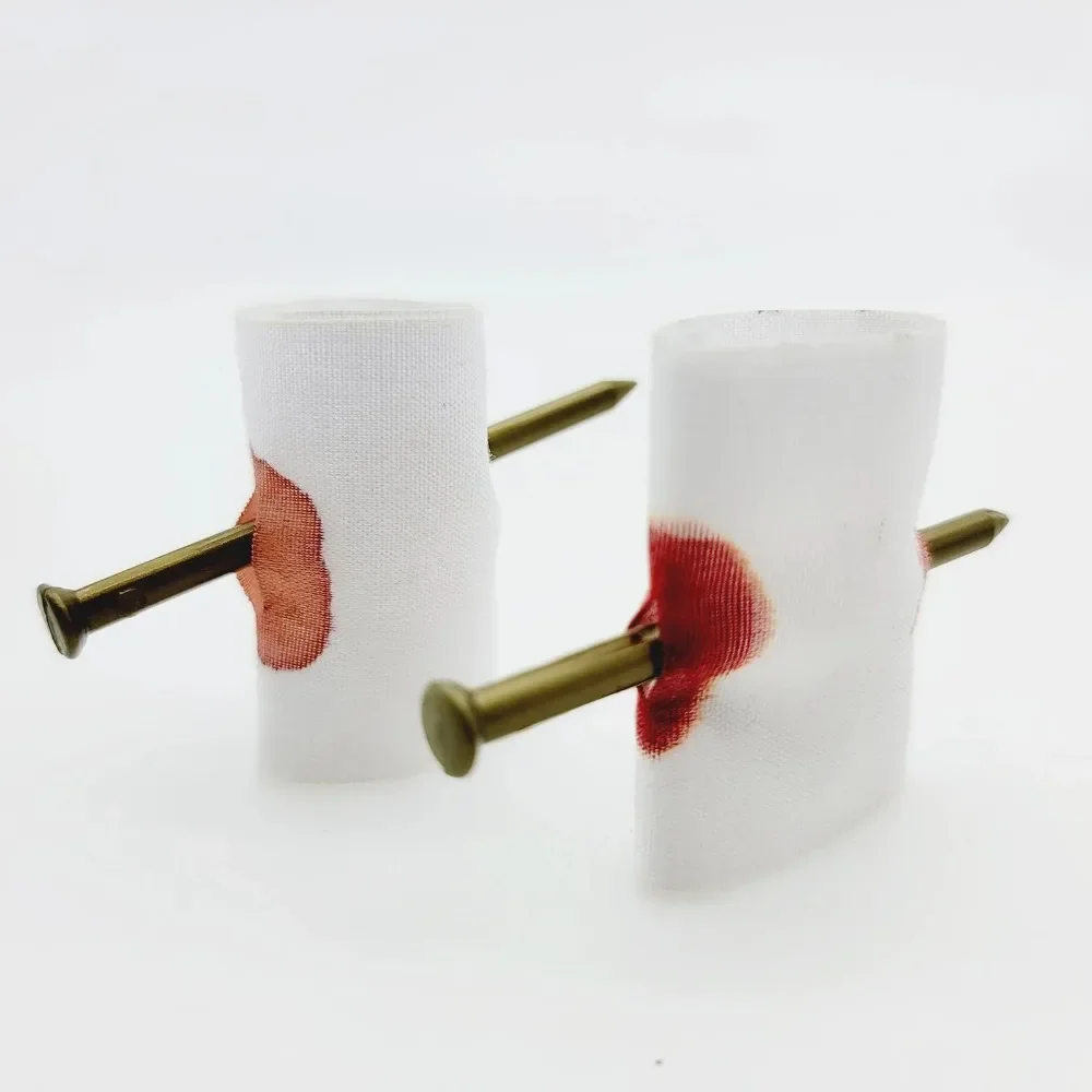 Imagine adding a shocking twist to your magic tricks or Halloween costumes with this realistic fake nail through finger. Crafted from durable plastic and metal, it exhibits authentic details like a shiny gold-brass finish on the nail, which is approximately 6.8 cm long. The prosthetic finger appears lifelike, enhanced with a gauze wrap measuring about 4.5 x 3.5 cm, creating a bloody or wound-like effect that fools the eye. Weighing just about 5 grams, it's lightweight and easy to handle, perfect for quick setup in social gatherings, parties, or spooky themed events. Its high craftsmanship ensures durability, making it a reliable tool for pranks, magic illusions, or gags meant to entertain or surprise your friends effortlessly.