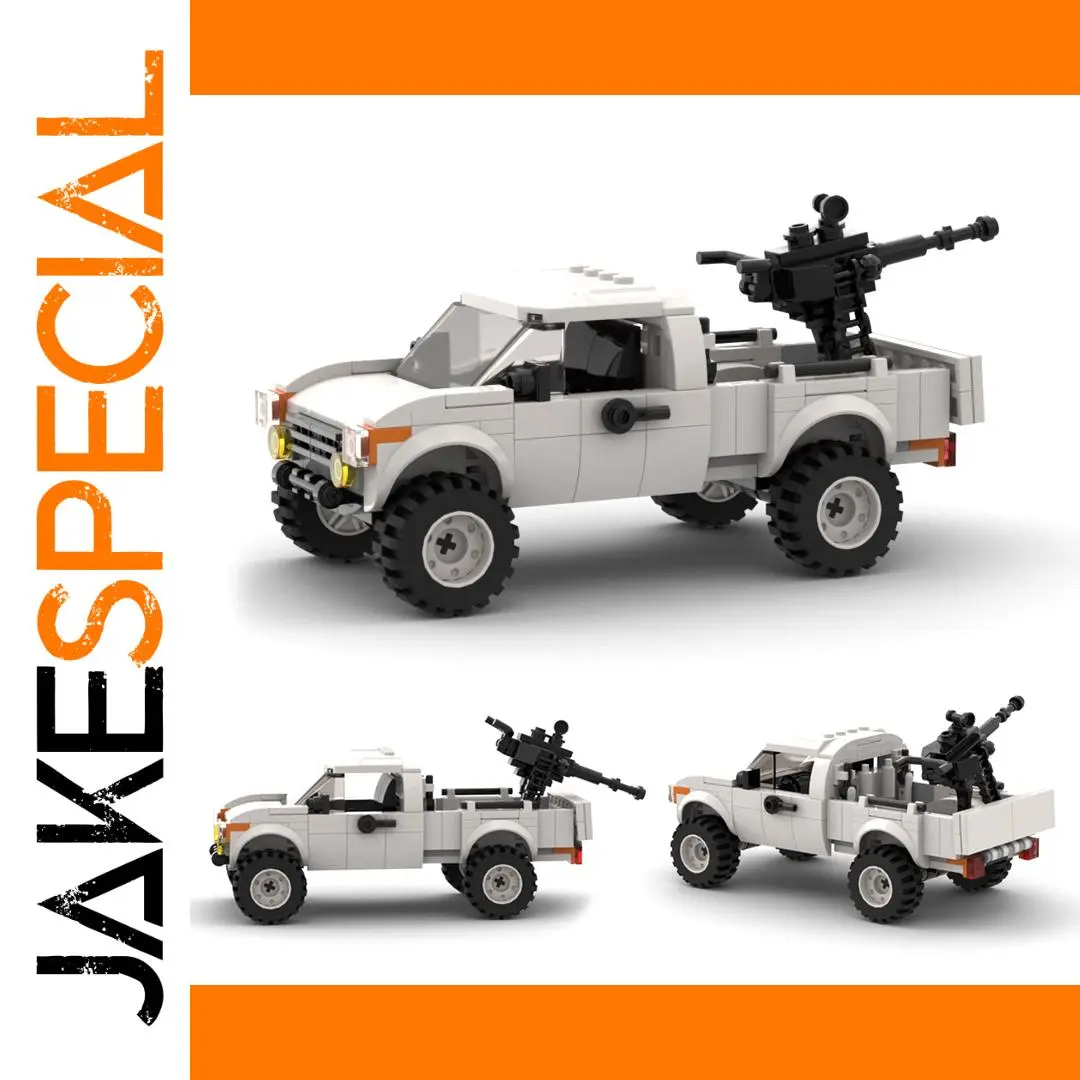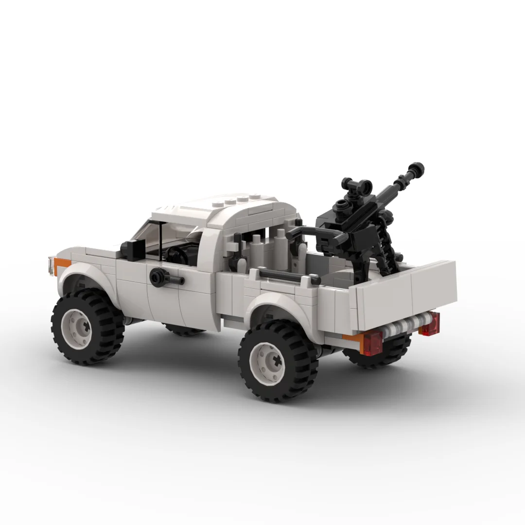 Picture yourself building this detailed, realistic military-style pickup truck, crafted from environmentally friendly plastic blocks. Its sleek white finish, complemented by bold black accents, captures a rugged, off-road vibe that stands out. The model features a cab with a sloped hood, transparent headlights with yellow fog lights, and a black grille with horizontal slats that evoke durability. The sturdy black tires with white rims and high ground clearance emphasize its tough, off-road capability. At the back, a mounted black weapon adds a tactical touch, perfect for showcasing military scenes or imaginative play. With precise details, this set offers a rewarding building experience, making it an ideal gift for enthusiasts and collectors alike. Its design balances realism with stylized toughness, perfect for display or action-packed adventures.