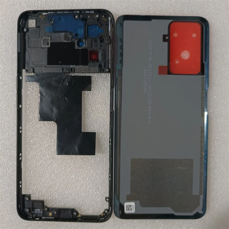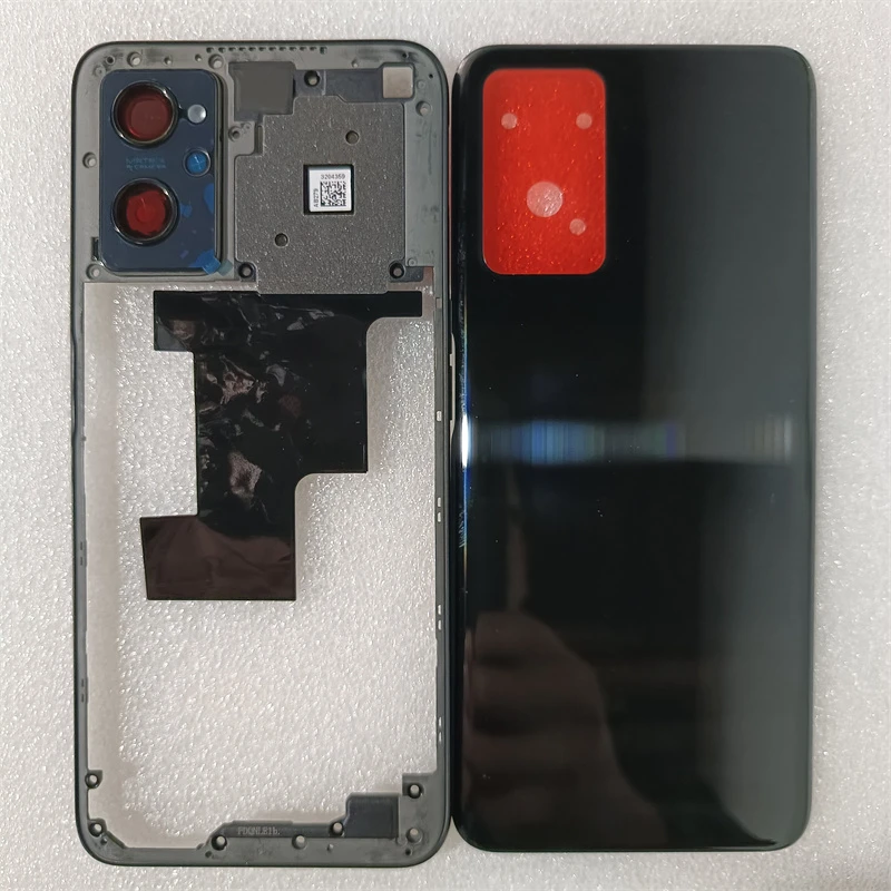 Enhance your Realme 9i RMX3491 with this full housing case, which includes a middle frame and a battery back cover featuring camera lens repair parts. Crafted from durable plastic, it is available in various colors: Only Mid Frame Black, Only Mid Frame Blue, Only Black Cover, Only Blue Cover, Full Set Black, and Full Set Blue. The middle frame features dark, circular cut-outs for the camera lenses and a clean design with additional rectangular cut-outs for functionality. The sleek, glossy black back cover provides an elegant finish, ensuring both style and protection for your device.