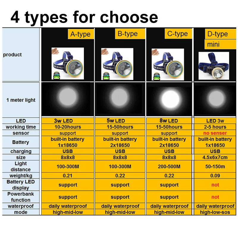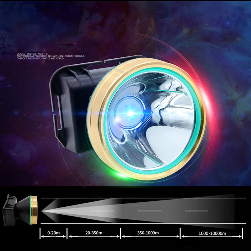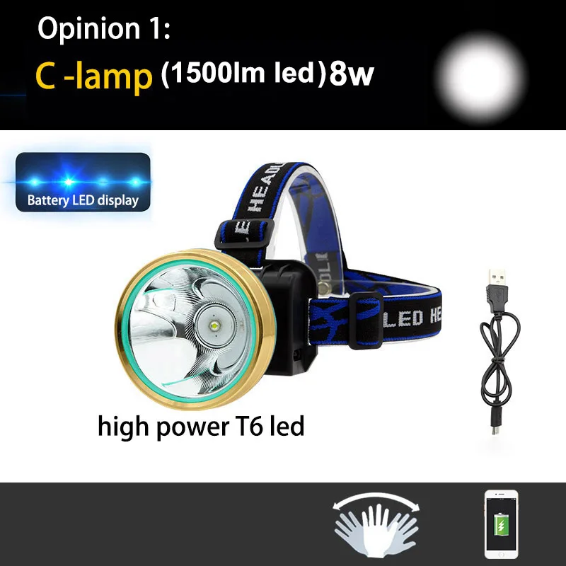 - The headlamp offers multiple LED options (5W, 8W, or 1500 lumens), incorporating advanced LED chips for high brightness, long lifespan, and energy efficiency for prolonged operation.