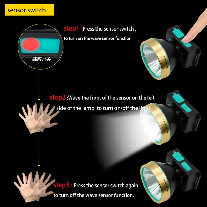 - This headlamp features a sensor-based motion switch for easy, hands-free operation, with multiple brightness modes (high, middle, low) controlled intuitively for various lighting needs.