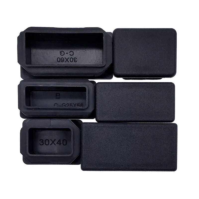 Transform your furniture with this sleek set of rectangular pipe plugs, crafted from durable plastic and reinforced with steel. Designed in a minimalist style, these black plugs feature smooth, matte finishes and precise, tapered edges for effortless insertion. Their versatile sizes—from 15x30mm to 50x100mm—allow for seamless fitting on various furniture legs and tubing, providing a clean, finished look while protecting surfaces. The slightly rounded top lips add a subtle grip for easy handling, making assembly or repairs smoother. These rectangular plugs are the perfect combination of functionality and style, helping to prevent slips or damage and enhancing the overall aesthetic of your home or office furniture. Durable, customizable, and practical, they are a smart addition to any project.