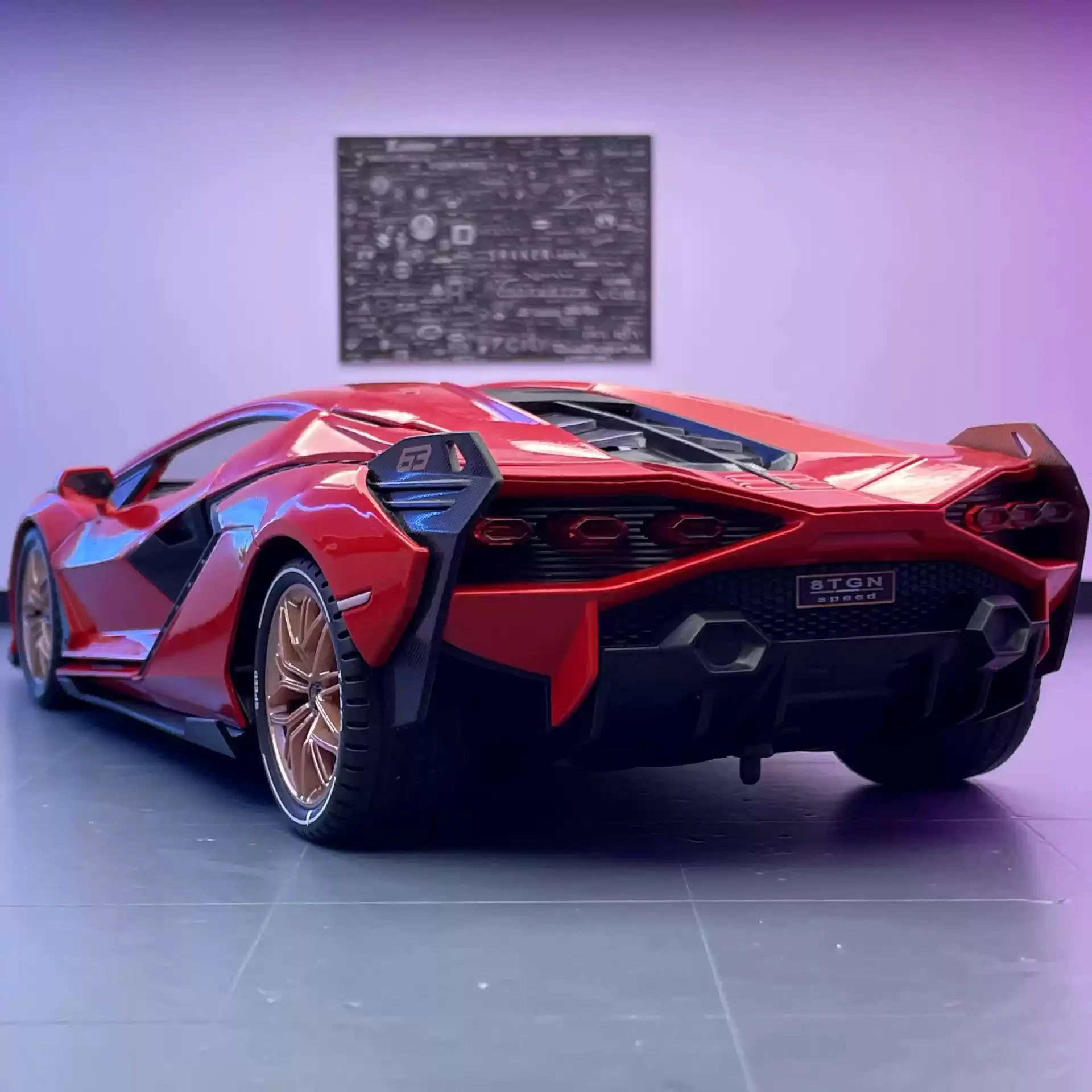 Immerse yourself in the excitement of owning this vibrant red 1:18 scale die-cast sports car model. Crafted from durable metal, this meticulously detailed collectible offers a realistic and dynamic aesthetic. Its sleek, aerodynamic silhouette features sharp angular lines, a pointed front nose, and a prominent rear spoiler, mirroring high-performance supercars. The transparent windshield provides a clear view of the interior, while black accents on air intakes and trim highlight the sporty design. The multi-spoke rims in metallic gold contrast beautifully with the glossy red finish, elevating its visual appeal. Perfect for display or as a thoughtful collector’s gift, this model embodies craftsmanship and sophistication, making it an eye-catching addition to any collection.