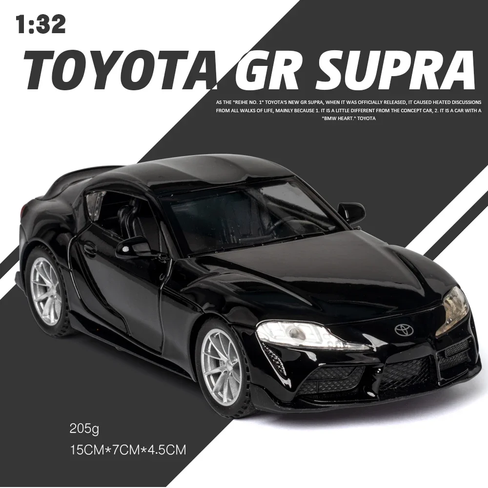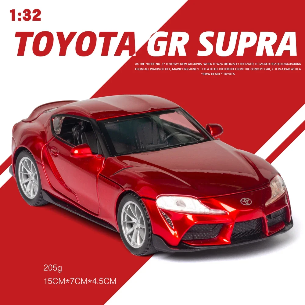 Experience the thrill of owning this meticulously designed 1:32 scale diecast alloy Toyota GR Supra. Crafted to impress, this high-simulation model features realistic details from its sharp contours to the iconic front grille. The glossy red finish radiates vibrancy and style, making it a standout collector's piece or a dynamic display in any collection. With working sound and light effects, it truly brings the vehicle to life, giving you the sensation of holding a miniature version of this sporty icon. The pull-back mechanism adds an engaging element, perfect for imaginative play or showcasing your automotive passion. Made from durable metal, it’s built to last while capturing every sleek detail of the real car, offering an authentic and captivating experience.