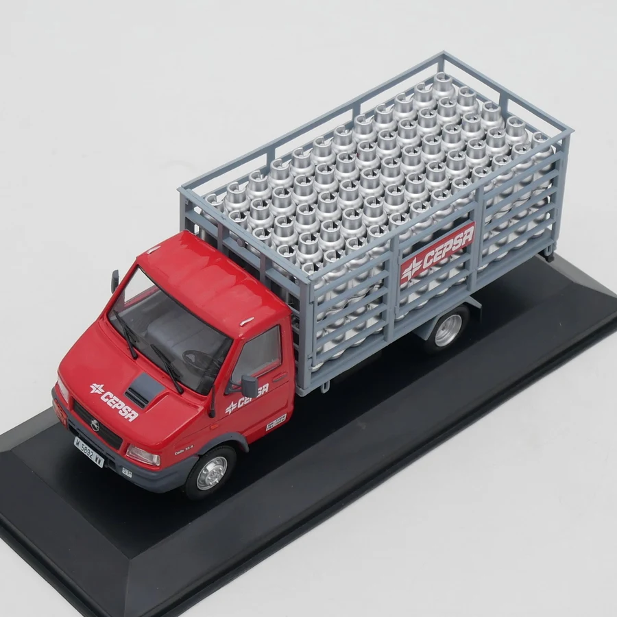 Imagine showcasing this exquisite miniature of the iconic 1994 Iveco Pegaso Daily Cepsa, expertly crafted to capture every detail of the original vehicle. The bold red cab, accented by subtle black elements like door handles, side mirrors, and small hood details, makes this model a striking display piece. The transparent windshield reveals a finely detailed cab interior, with side windows adding authenticity. The open-frame gray cargo cage, with its grid pattern, houses neatly arranged white containers, emulating real transportation loads. The realistic rims and tread patterns on the wheels enhance its craftsmanship. This meticulously finished model, at 1:43 scale, is perfect for collectors who appreciate precision and craftsmanship, making it an eye-catching addition to any display collection.