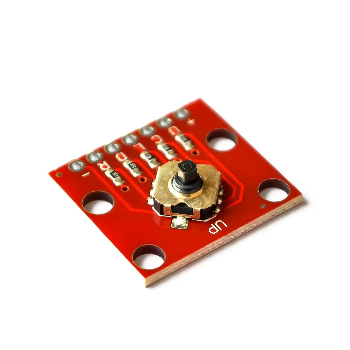 Experience precise control with this vibrant red, breadboard-friendly 5-channel tactile switch breakout module. Designed with a sleek, minimalist black joystick switch at its center, the module features five directional inputs—up, down, left, right, and a clickable center. The clear, compact layout allows for easy integration into your projects, making it ideal for small controller interfaces, custom joystick setups, or miniature input devices. The bright red PCB contrasts sharply with the black switch and metallic resistors, creating a visually appealing and highly functional module. Its internal pull-up resistors are set so that the outputs read low when pressed and high when released, adaptable for pull-down operation, enhancing versatility across various applications. With this module, you gain reliable, tactile input control for your electronic projects.