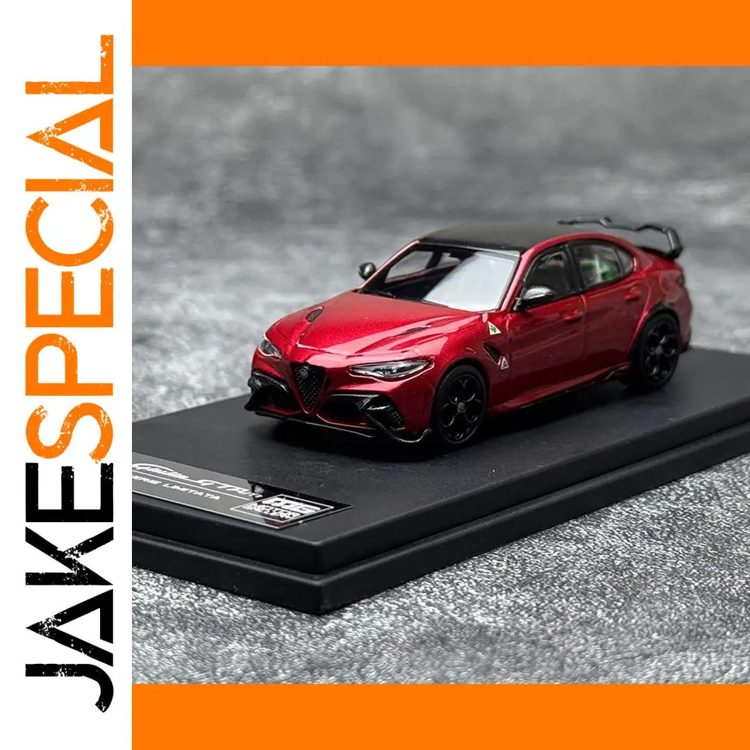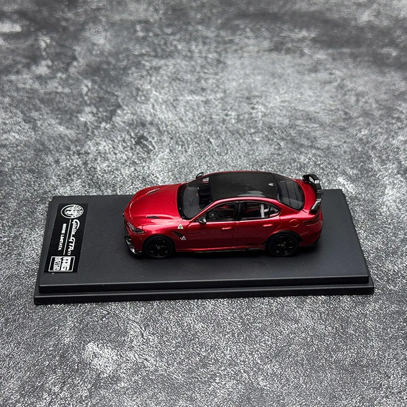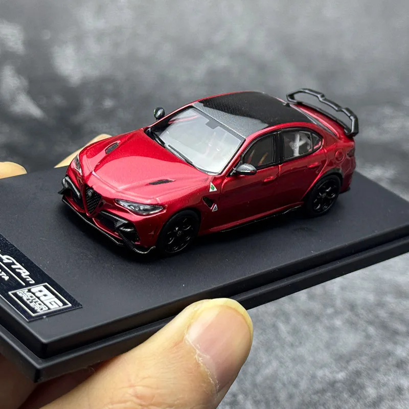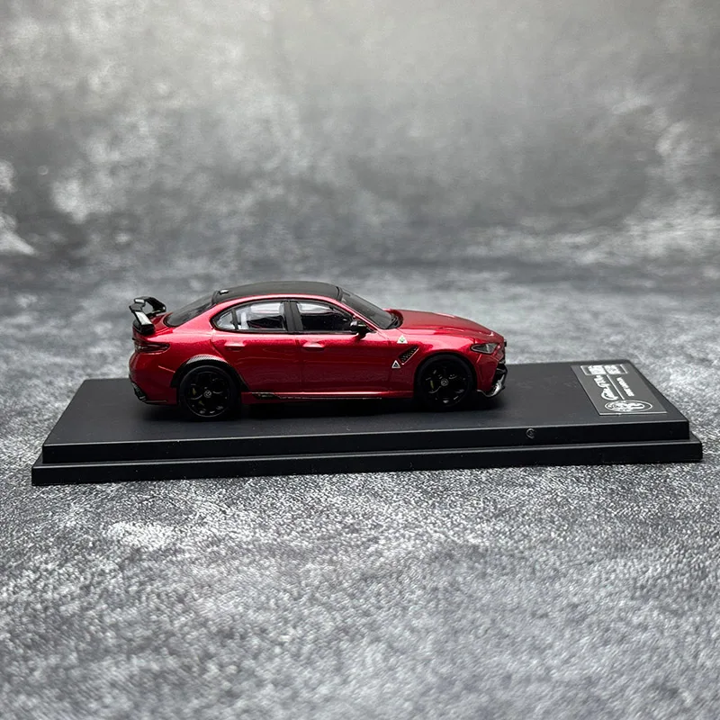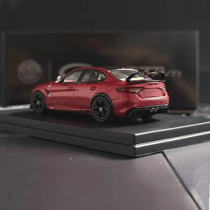 Immerse yourself in the captivating world of automotive design with this meticulously crafted diecast model of an Alfa Romeo Giulia Gtam. Featuring a vibrant, glossy red finish, this 1:64 scale replica beautifully captures the sporty silhouette and aerodynamic lines of the original vehicle. The front fascia boasts a distinctive triangular grille matched with sharp, narrow headlights that exude an aggressive stance. The side profile is emphasized with black alloy multi-spoke wheels and precise contour lines, enhancing its realistic appeal. The rear showcases a sporty spoiler, detailed taillights, and exhaust pipe, bringing out the high-performance spirit. Perfect for collectors, this model is a stunning decorative piece that showcases craftsmanship and style at its finest.