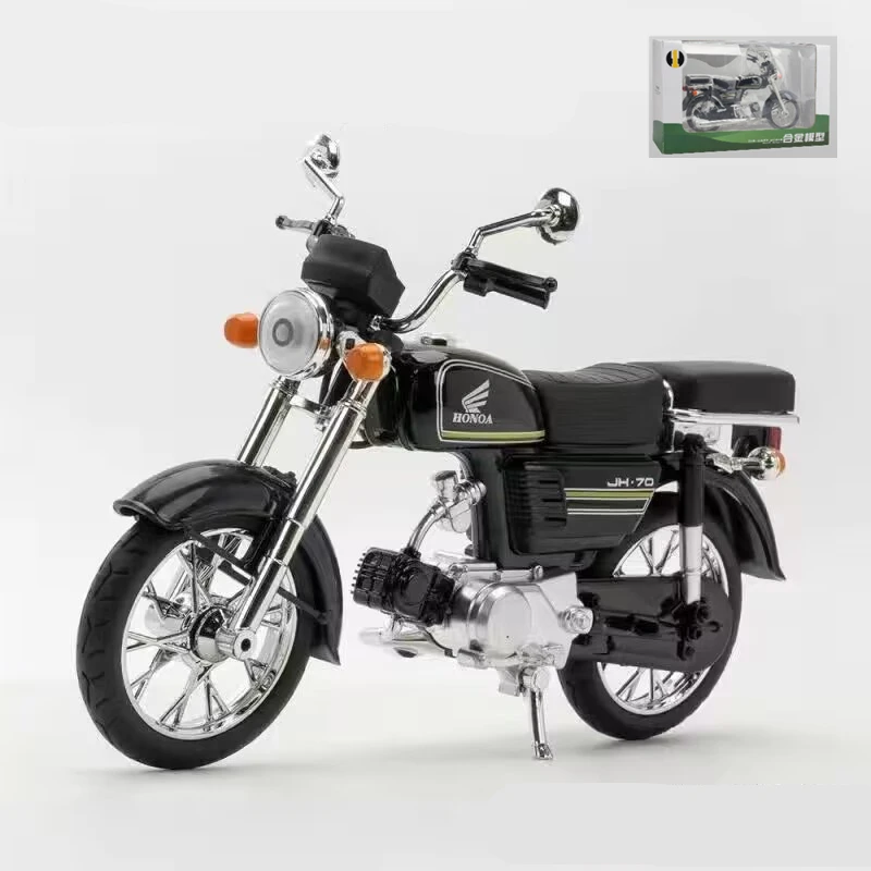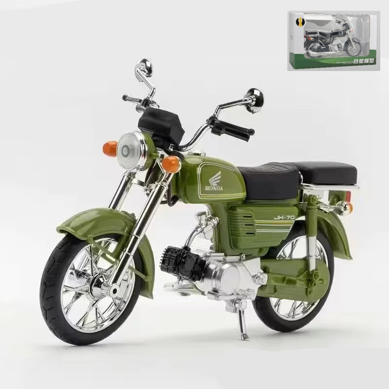 This 1/10 scale diecast motorcycle model, crafted from alloy and plastic, vividly replicates a street sports motorcycle with meticulous detail. Featuring a vibrant red, green, or black finish, it showcases chrome accents on the exhaust pipe, wheel spokes, and suspension forks, alongside textured black seats for realism. Measuring approximately 1:10 in scale, this collectible is suitable for display or enthusiasts aged 14 and above. Its glossy, polished surface highlights the sleek, aggressive design and intricate components like round chrome mirrors and striped fuel tank decals. Perfect for collectors, it offers a highly detailed representation of a modern street racing motorcycle for display or gifting.
