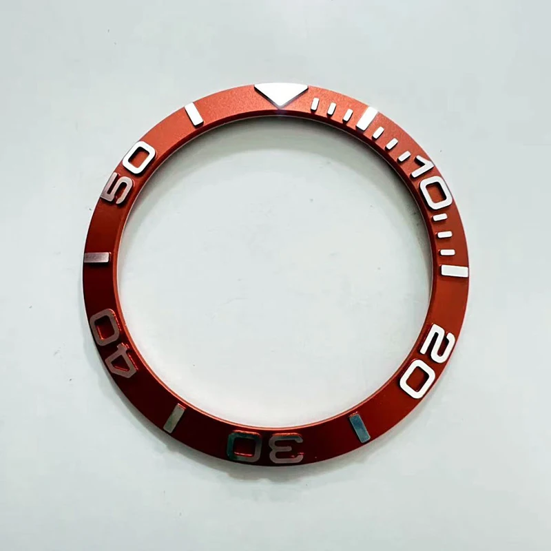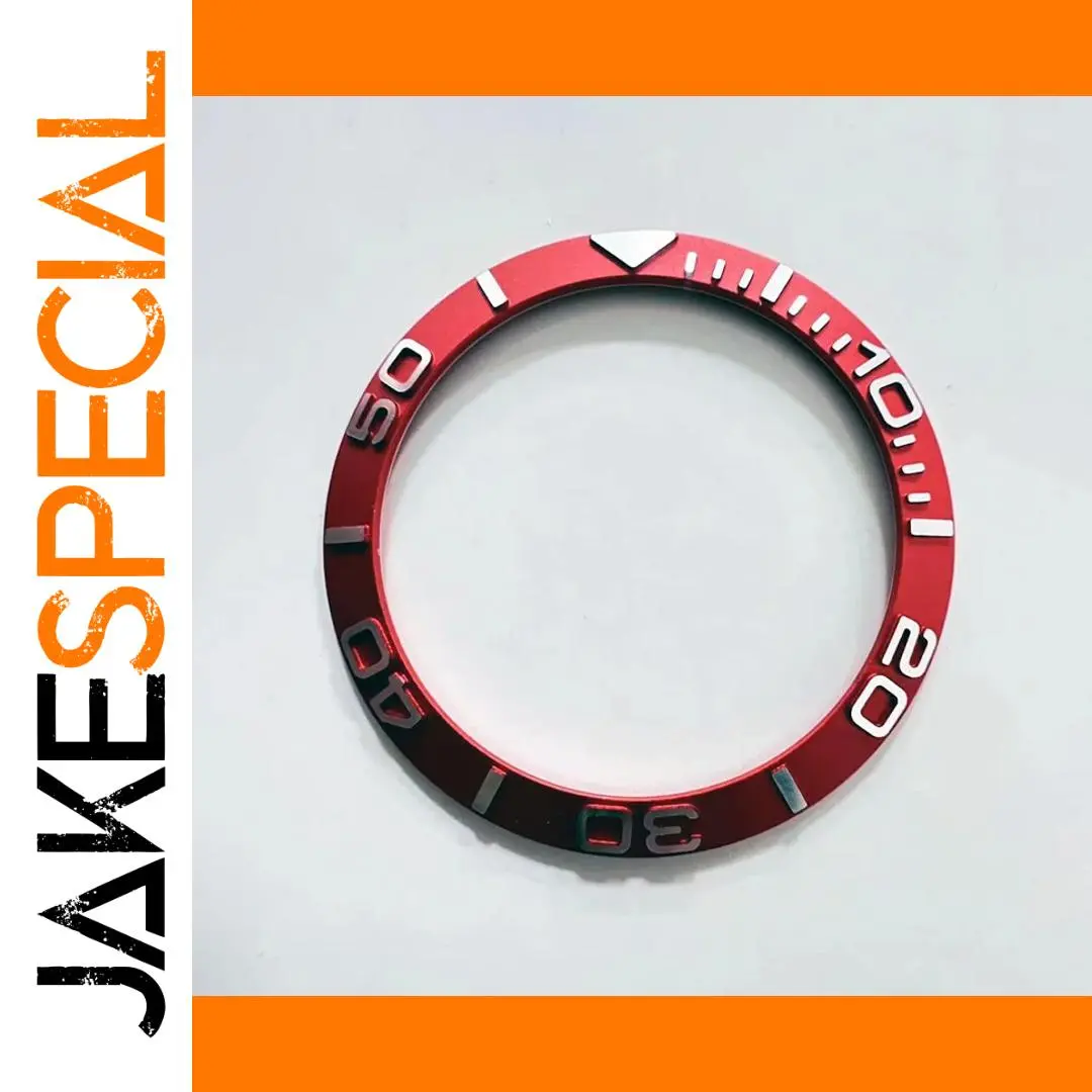 Enhance your dive watch's appearance with this stunning 38mm red aluminium bezel insert. Featuring a sloped design with beveled edges, it adds depth and a modern touch to your watch. The shiny, polished surface reflects light beautifully, giving your timepiece a fresh, sporty look. Large, contrasting silver numerals at 20, 30, 40, and 50 mark elapsed time clearly, while smaller markers aid in precise timing. Perfectly suited for SKX007, SKX009, and SRPD watch cases, this bezel insert offers both style and functionality. Whether you're repairing or customizing, it provides a professional finish that elevates your watch's aesthetic and performance.