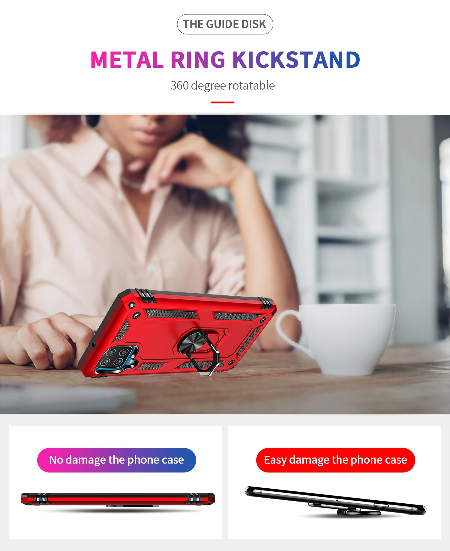 Experience ultimate protection and style with this rugged case designed specifically for the Samsung Galaxy A12. Its dual-layer construction combines durable edge TPU with a sturdy PC shell, providing comprehensive defense against drops, scratches, and impacts. The military-grade air-cushion technology at each corner ensures shock absorption, while the textured surface and reinforced corners enhance grip and durability. The bold red color, accented by black layered panels and a textured blue border around the camera cutout, creates an eye-catching, high-tech look. The large, circular metal ring holder doubles as a stable kickstand for hands-free viewing, while the built-in magnetic sheet allows quick attachment to magnetic car mounts. This slim yet rugged case is dustproof, anti-scratch, and non-slip, making it the perfect companion for everyday use.