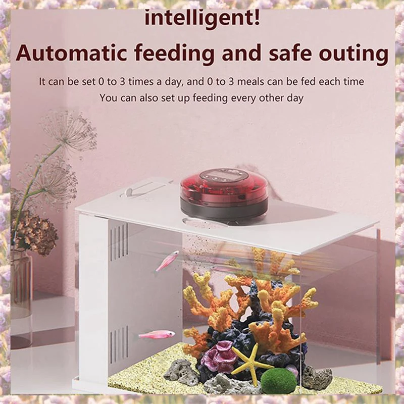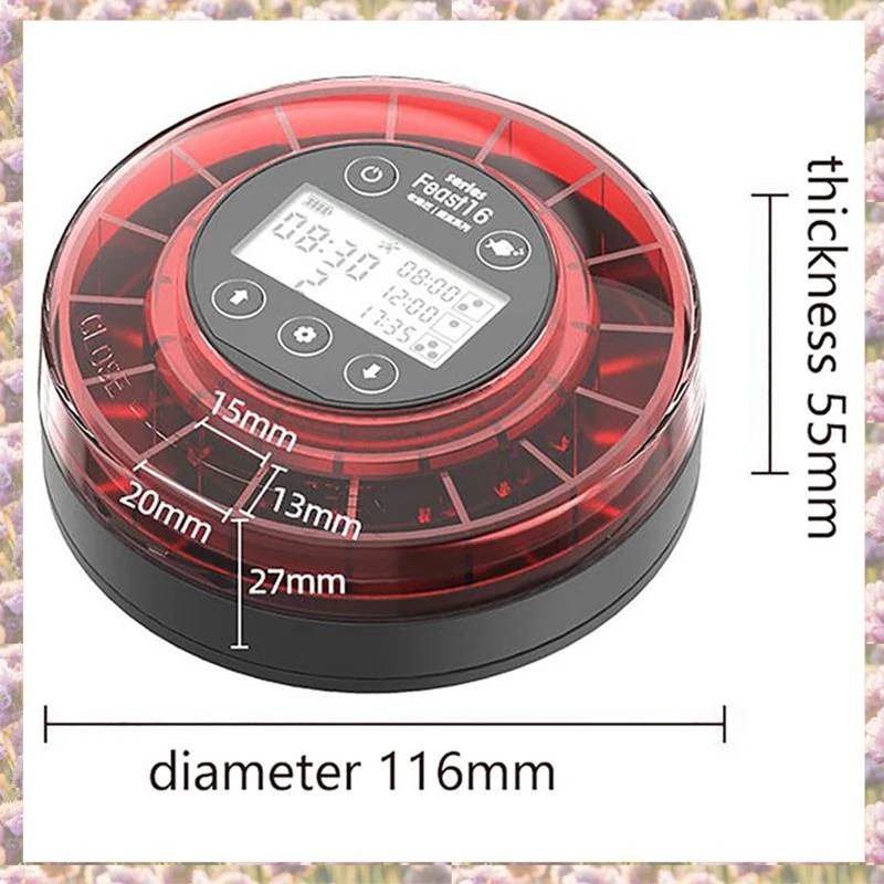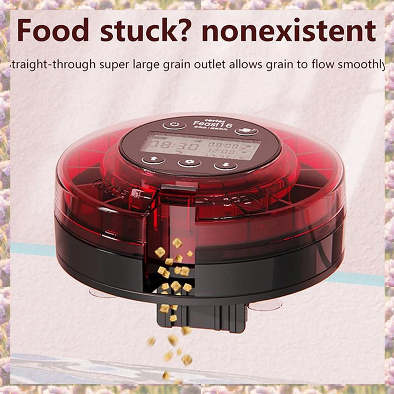 Experience effortless fish care with this innovative automatic fish feeder, designed to simplify your routine and ensure your aquatic pets are fed consistently. Crafted from durable, high-gloss red ABS plastic, this sleek device features a compact circular shape measuring 11.6 cm in diameter and 5.5 cm in height, seamlessly fitting into any aquarium environment. Its transparent top allows you to check the food level at a glance, while the LCD display provides easy access to settings, schedule, and portion size adjustments. Equipped with a rechargeable battery and USB cable, this feeder offers reliable power and convenient recharging options. The three adjustable gear settings dispense between 50 and 100 grams per feeding, giving you complete control over your fish's diet. Enjoy peace of mind knowing your fish are well cared for, even when you're away.