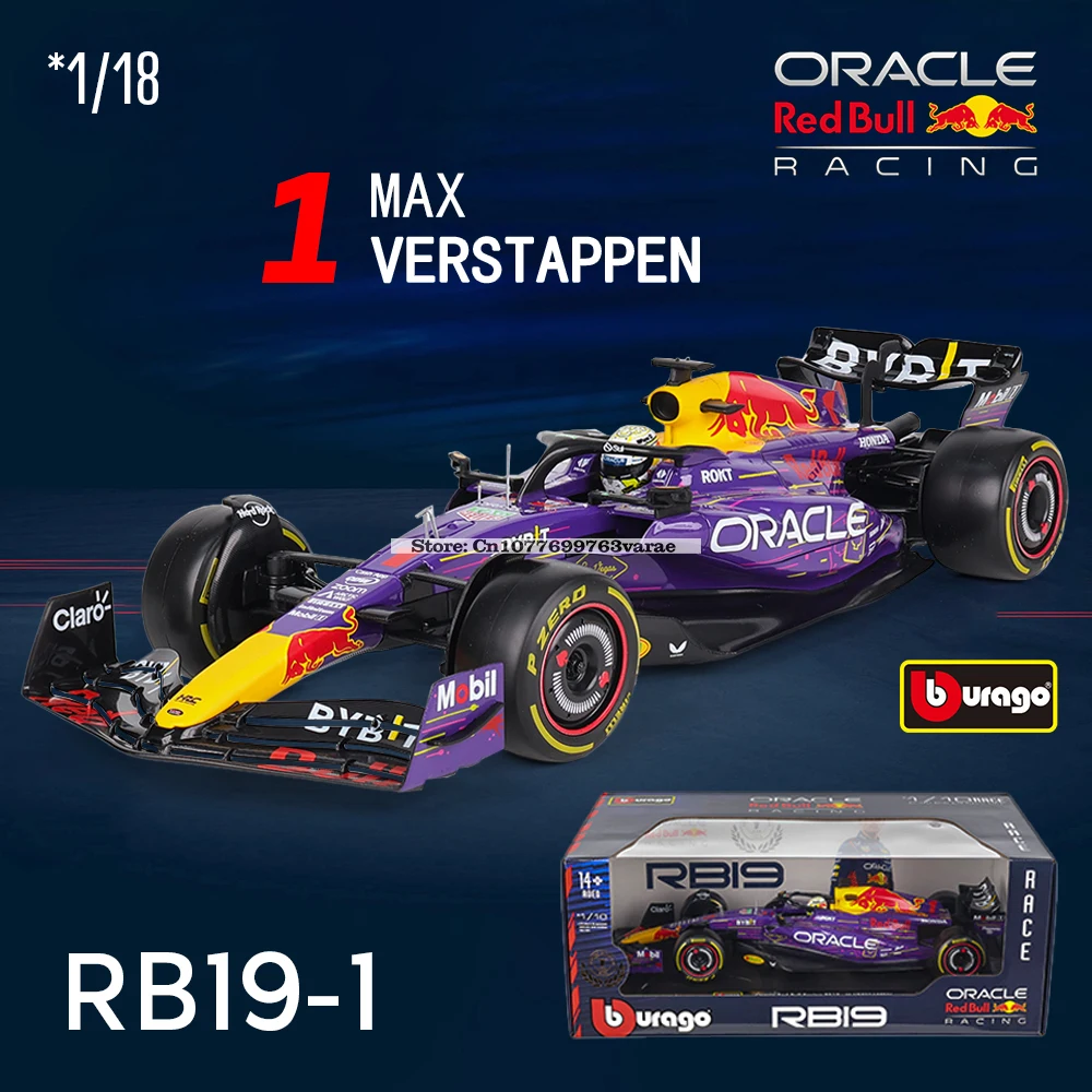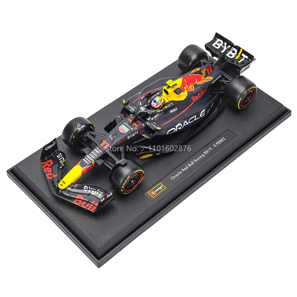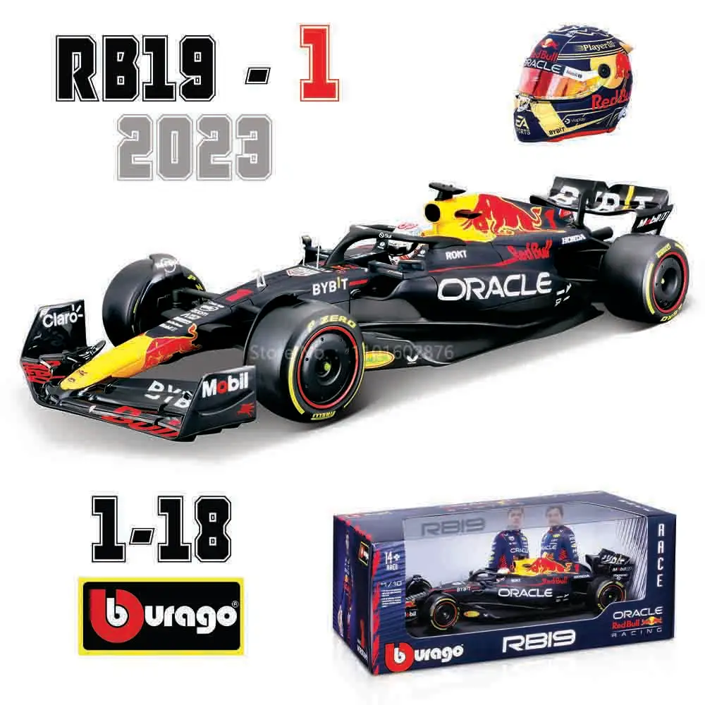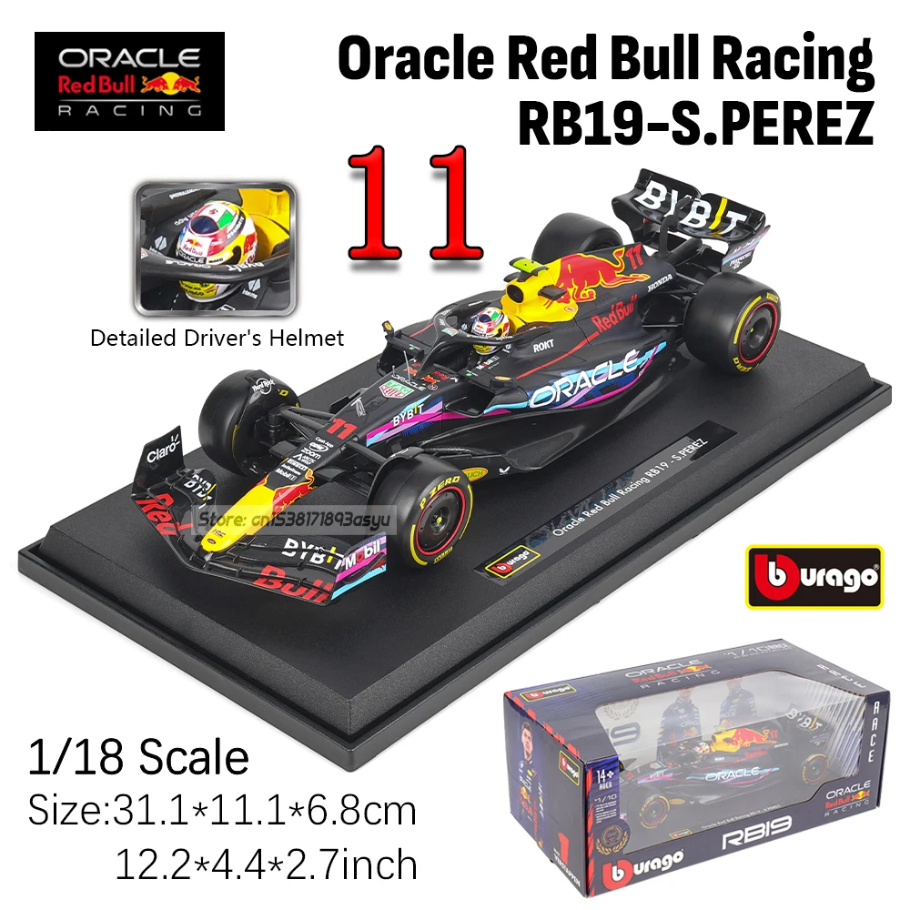 - Authentic 1:18 scale diecast model made from zinc alloy, ABS, and rubber, closely resembling the actual 2023 RB19 F1 car driven by Verstappen and Perez, with precise detailing for collectors.