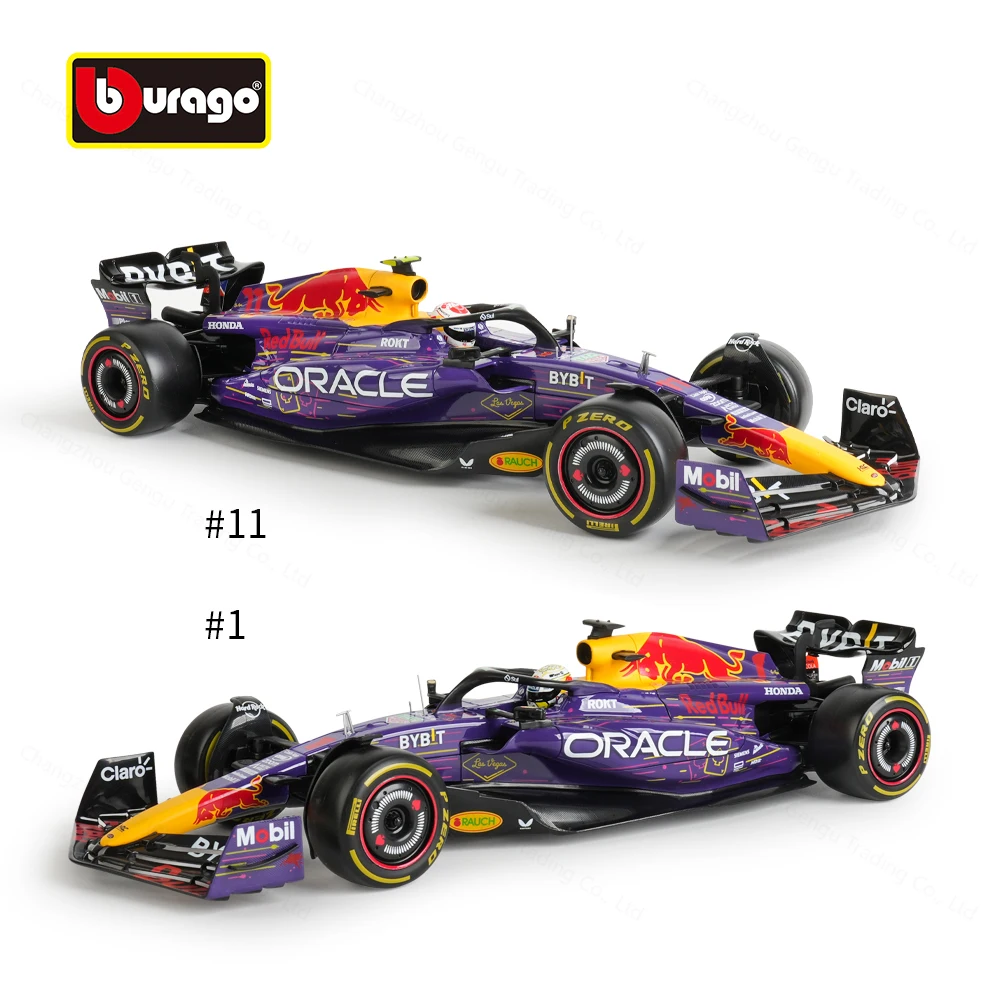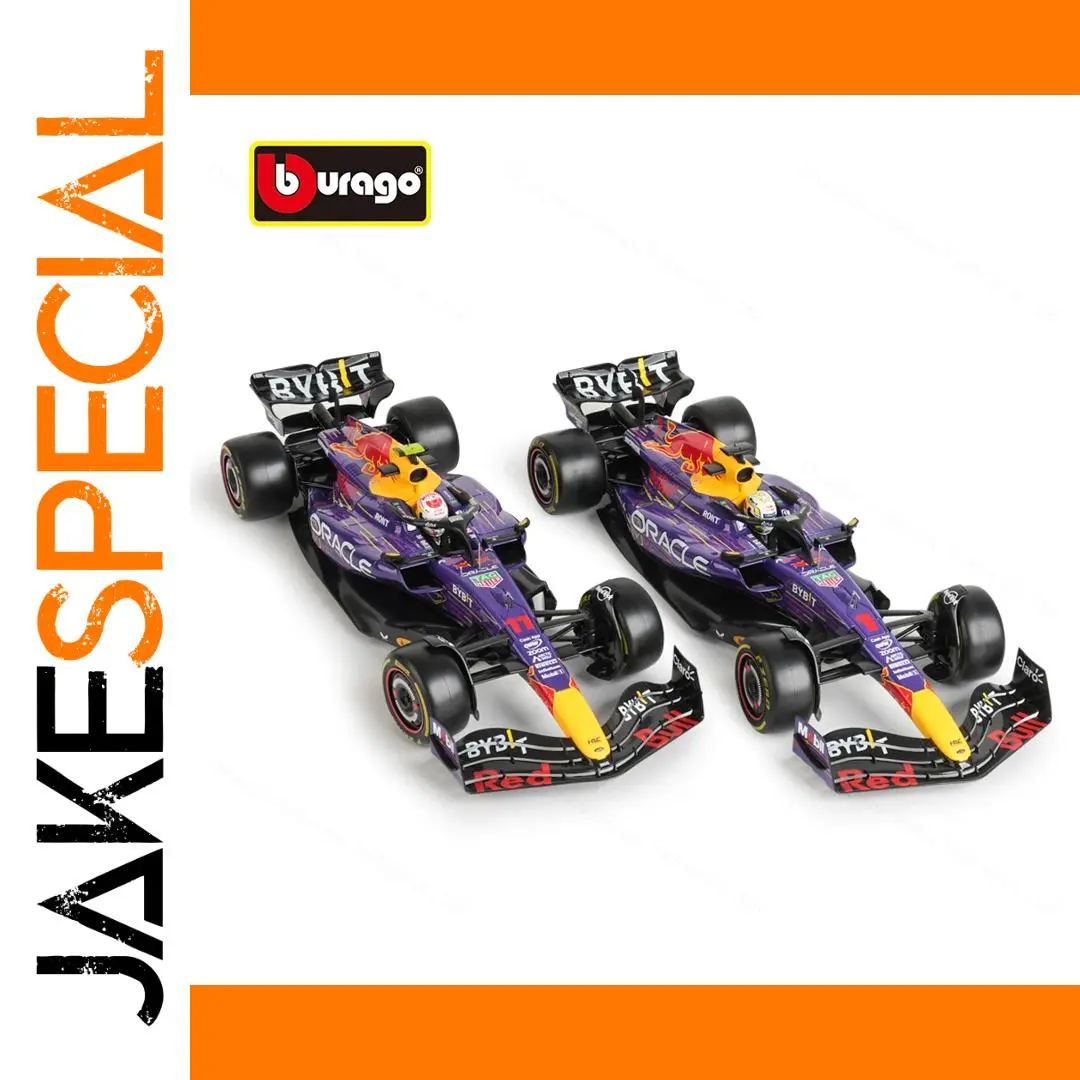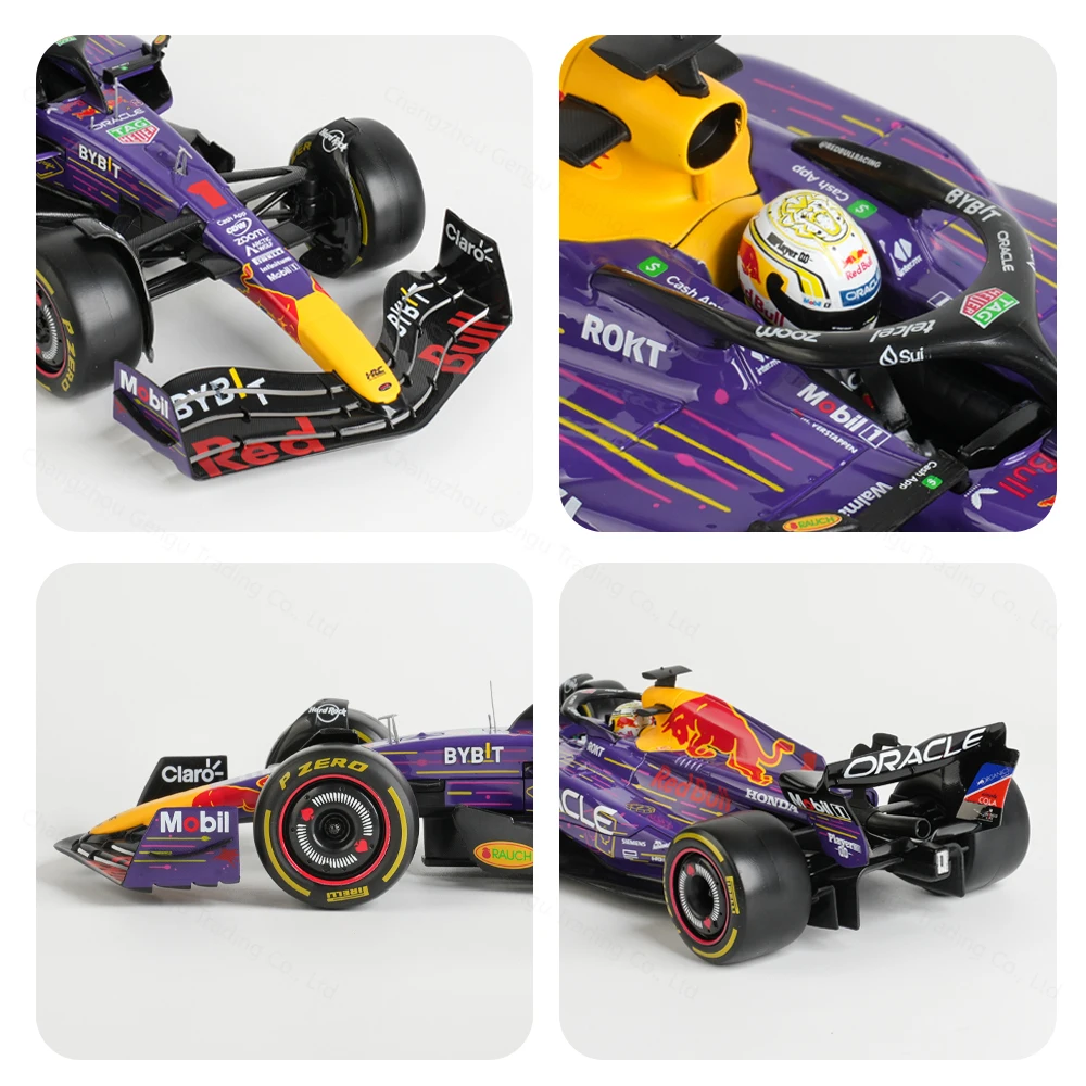 Experience the thrill of Formula 1 racing with this highly detailed die-cast model of the Red Bull RB19 from the 2023 season. Crafted with precision, this 1:18 scale replica captures every aerodynamic feature, sponsor logo, and vibrant color scheme of the real racing car. The striking purple body contrasted by a bright yellow nose and detailed black wheels with yellow markings bring this model to life. The cockpit showcases a meticulously modeled steering wheel and helmet, adding realism. With a textured airflow finish and intricate spoilers, this model reflects the cutting-edge design of modern racing. Perfect for collectors, it makes a stunning display piece that captures the essence of high-speed competition and innovation.