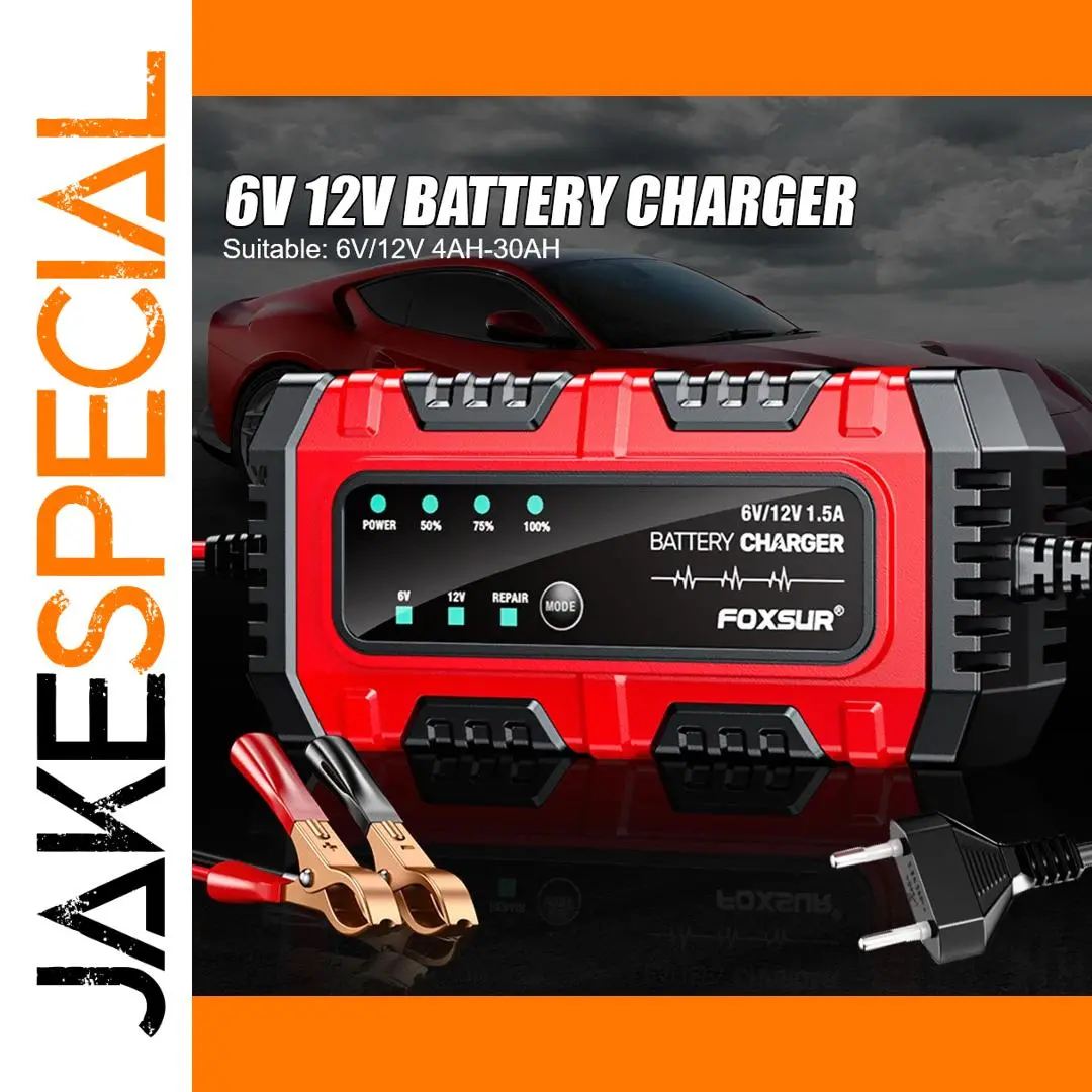 Experience safe and efficient vehicle battery maintenance with this vibrant red FOXSUR car battery charger. Designed with a modern, rugged aesthetic, it features black accents and a digital interface showing LED indicators for easy status monitoring. The compact rectangular shape makes it easy to handle and store, perfect for both professional technicians and car enthusiasts alike. Its intuitive controls include a MODE button for manual voltage switching and LEDs indicating power, charge progress, and mode detection. Built with durability and safety in mind, this charger is suitable for various lead-acid battery types, offering reliable performance even in challenging conditions. Trust it to keep your vehicle’s batteries optimal and ready for use at all times.