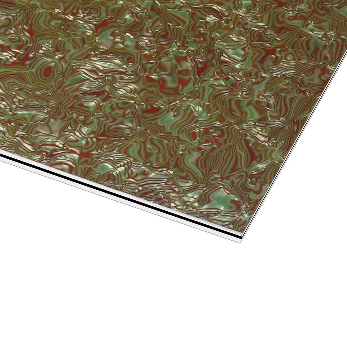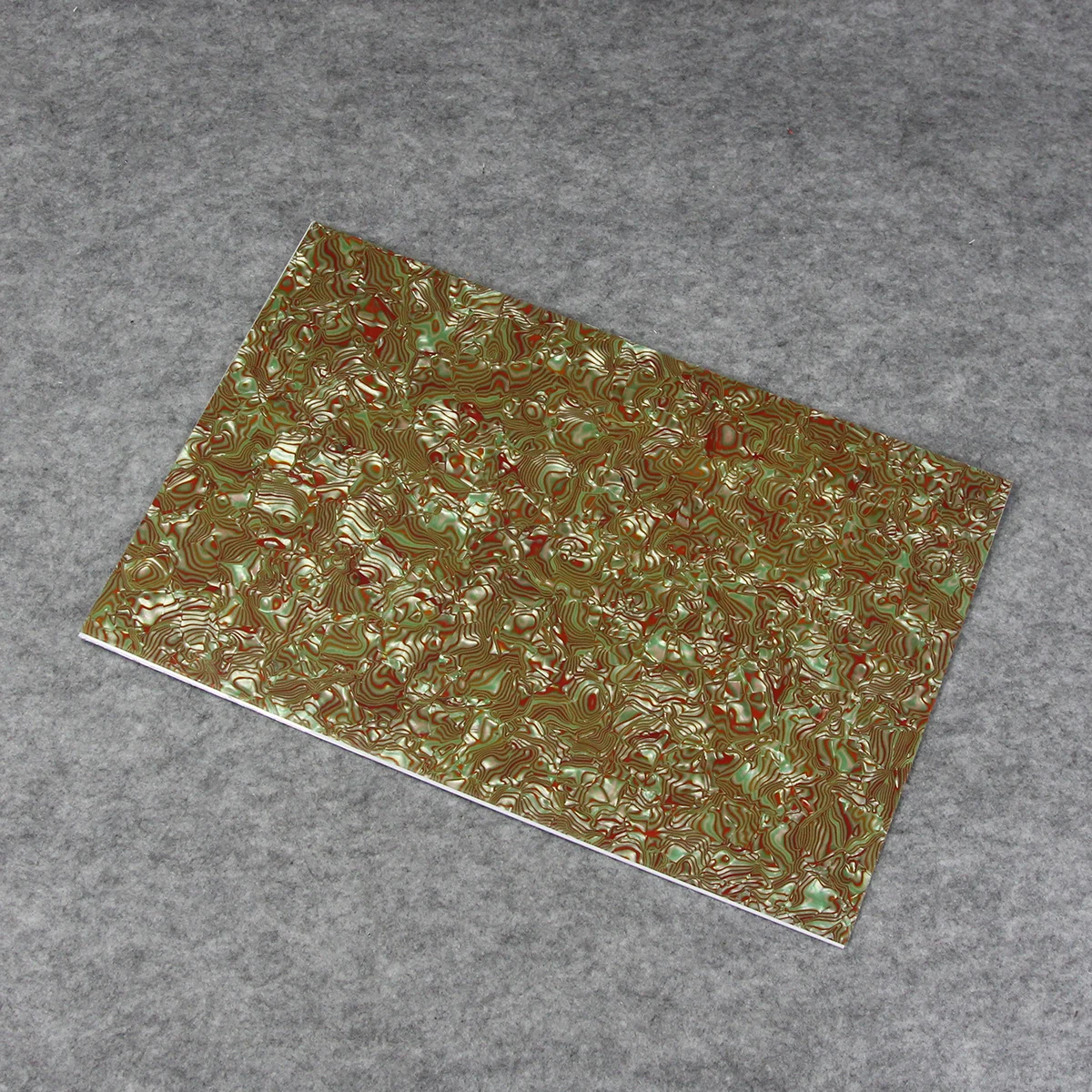 Imagine customizing your guitar or bass with this striking and durable pickguard material. Measuring 43 cm by 29 cm with a thickness of 2.3 mm, this multi-layer sheet combines three PVC layers and a vibrant celluloid top layer for enhanced resistance and style. Its glossy, smooth surface under a shimmering, colorful film reveals a swirling abstract pattern accented with rich gold and bronze tones. Striking red and green stripes run through the design, adding contrast that elevates the aesthetic appeal. Whether you're redesigning your P, JB, or other bass models, this sheet offers a high-quality, scratch-resistant surface that’s perfect for personalized guitar accessories. It’s an excellent choice for any enthusiast aiming for a unique, artistic touch.