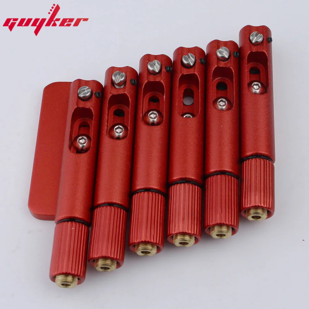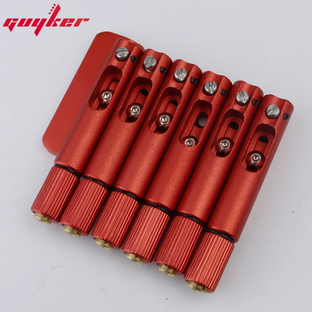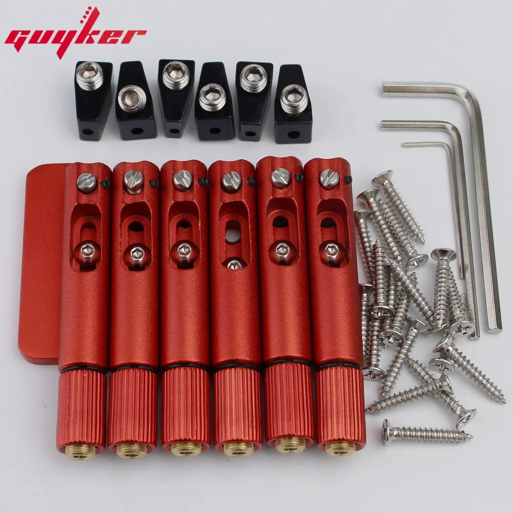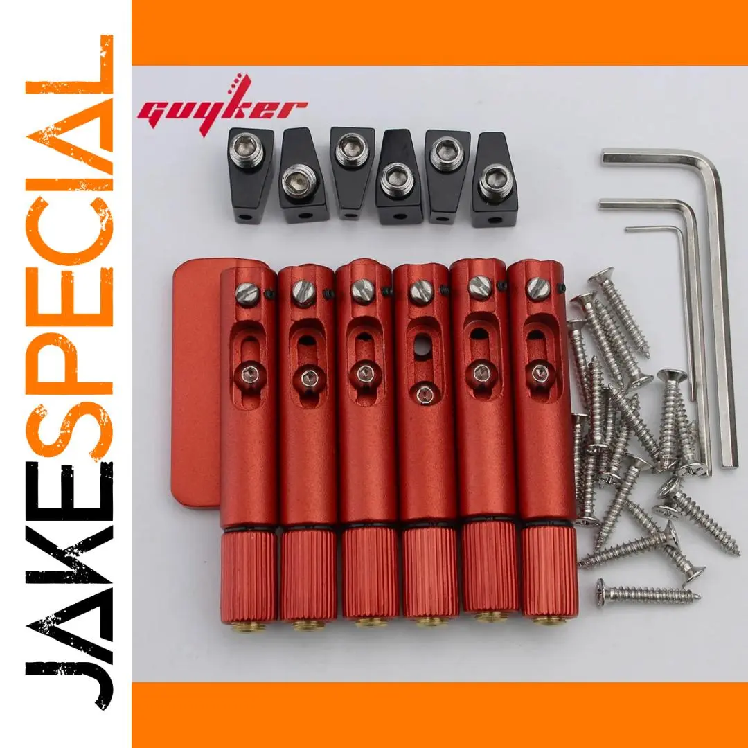 Transform your headless electric guitar with this stunning fixed fan bridge, precisely designed for 6, 7, or 8-string models. Crafted from durable metal, its bold red saddles stand out vividly against the sleek black mounting blocks, creating an eye-catching aesthetic that combines modern style with technical excellence. The set includes six red saddles with knurled, threaded ends, four black mounting blocks with central studs, and scattered silver screws for secure installation. Two durable hex keys are included for easy adjustments. Whether you're upgrading or customizing, this kit offers outstanding performance, compatibility, and a sharp visual appeal, helping you achieve perfect intonation and precise tuning for your unique playing style. Experience professional quality in a versatile design that elevates your guitar’s look and sound.