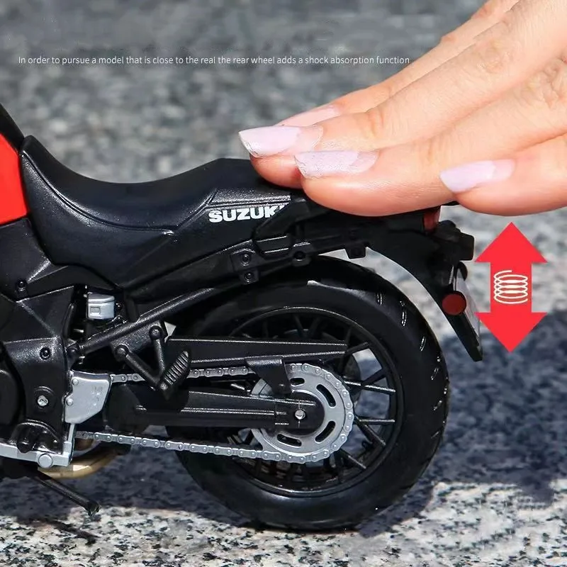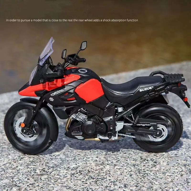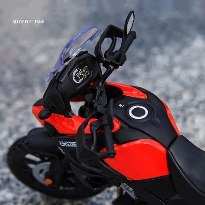 Imagine owning this highly detailed 1:12 scale diecast motorcycle model, meticulously recreated to reflect the bold and aggressive style of a street sports bike. Crafted from alloy and plastic, this model captures every contour and line of the real Suzuki V-Strom, with a vibrant red finish accented by sleek black details. Its aerodynamic fairing, large clear windshield, and realistic mechanical components, like the engine and exhaust pipes, make it an impressive display piece or collector’s item. The textured, contoured seat and detailed wheels with tread pattern and disc brakes add to the authenticity. Whether for display, gifting, or inspiring motorcycle passion, this model brings the thrill of a street-ready bike into your space with precision and style.