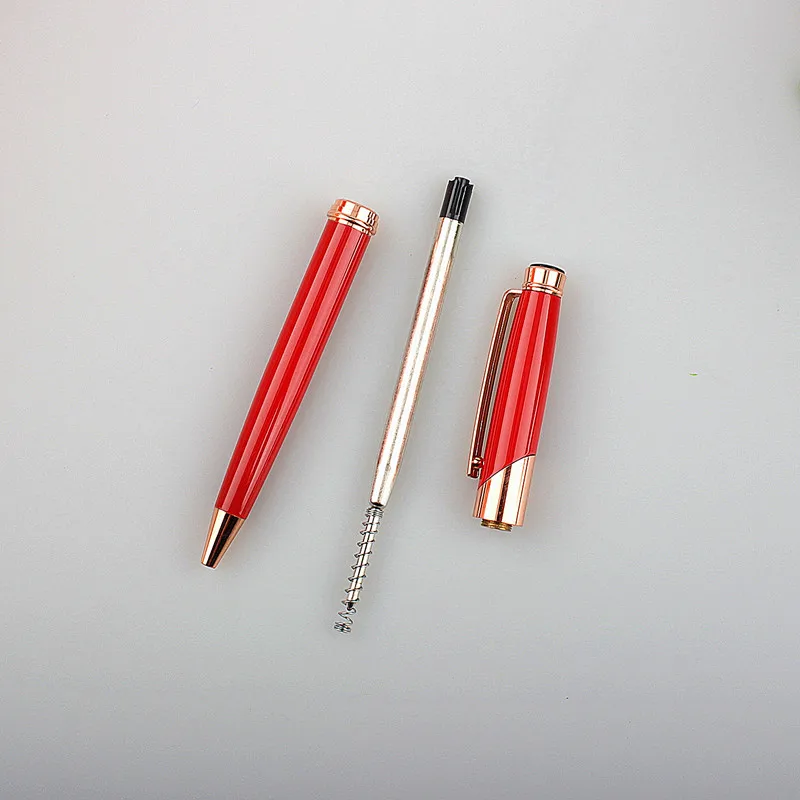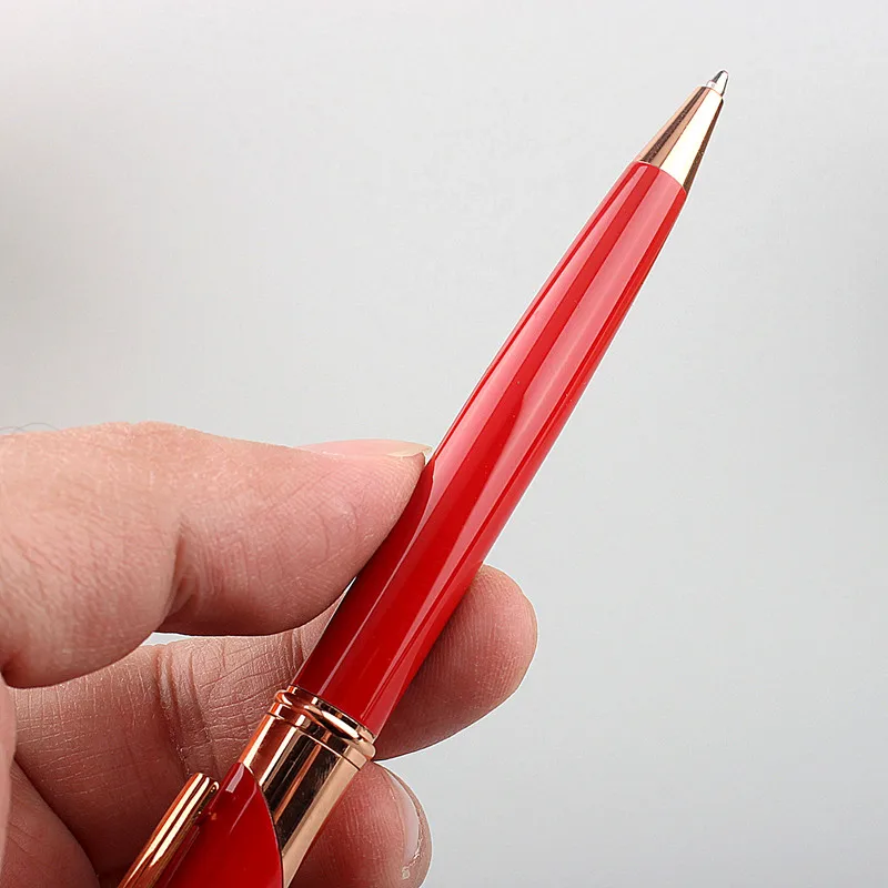 Imagine adding a touch of sophistication to your everyday writing with this stunning red metal ballpoint pen from MONTE MOUNT. Its vibrant, glossy red finish and smooth, polished surface create a sleek, eye-catching look that instantly elevates your professional or academic workspace. The shiny metallic band just below the clip, accented with a luxurious gold or rose gold hue, provides a refined contrast that highlights its premium craftsmanship. The clip, with its textured vertical ridges, ensures secure attachment and adds to the high-end aesthetic. Designed for durability and style, this pen delivers a comfortable writing experience, making it perfect for both everyday use and special occasions where image matters.