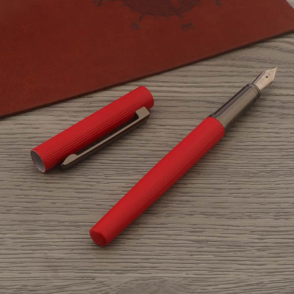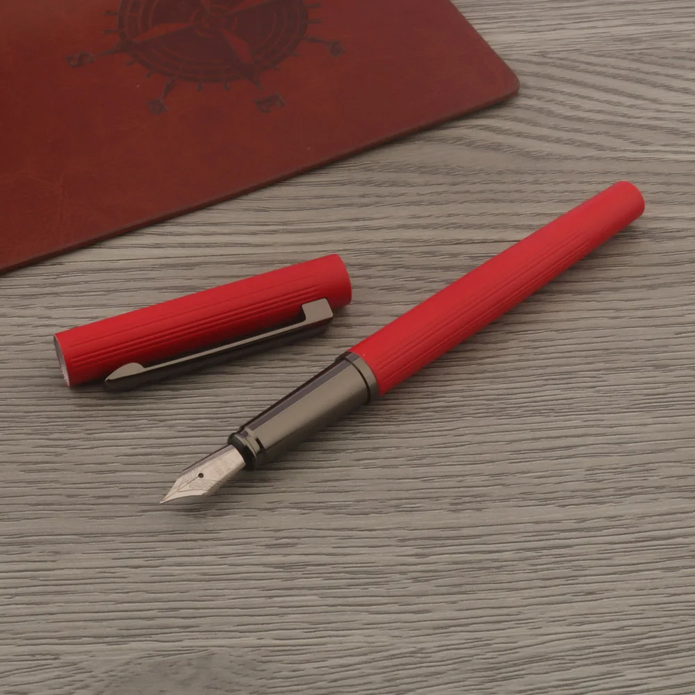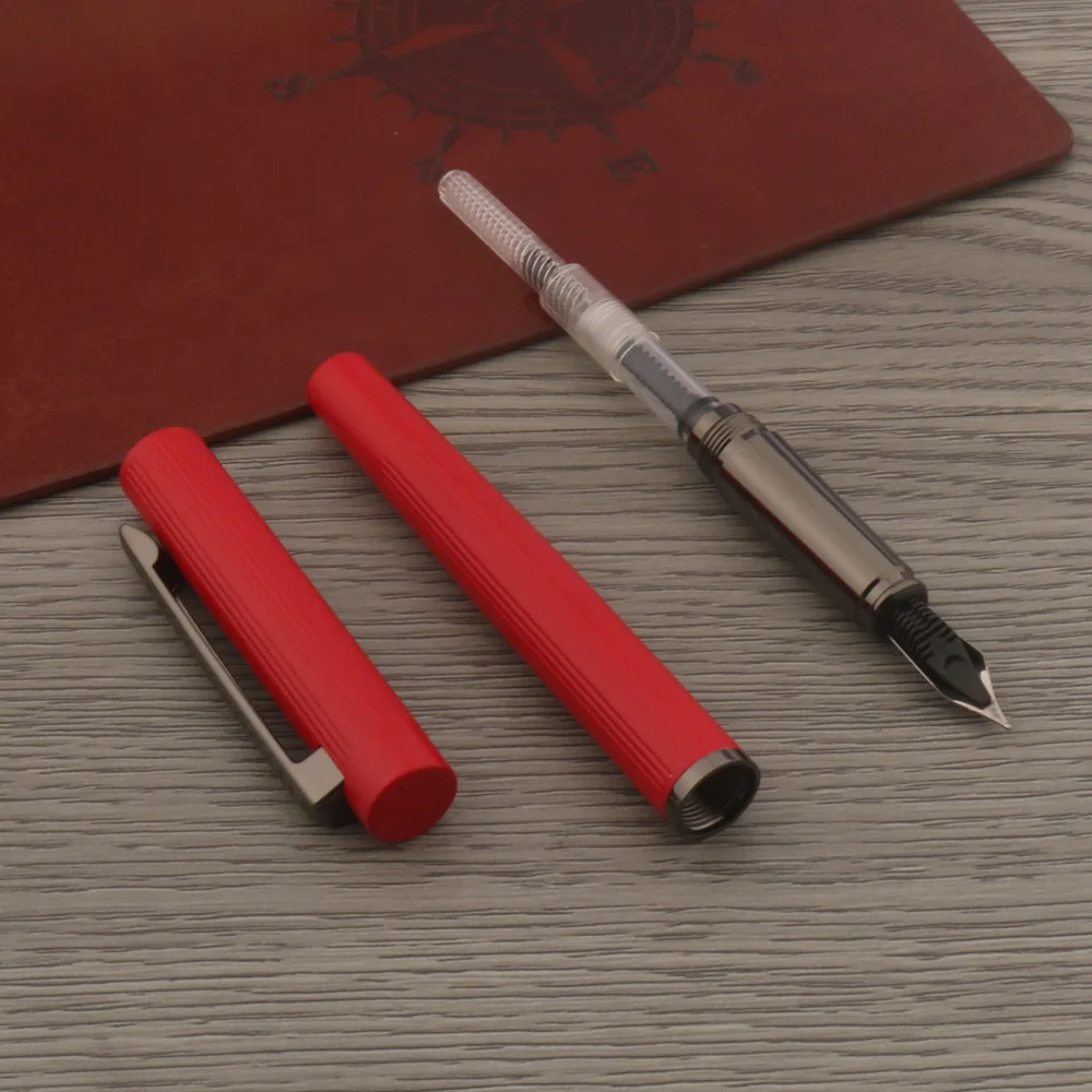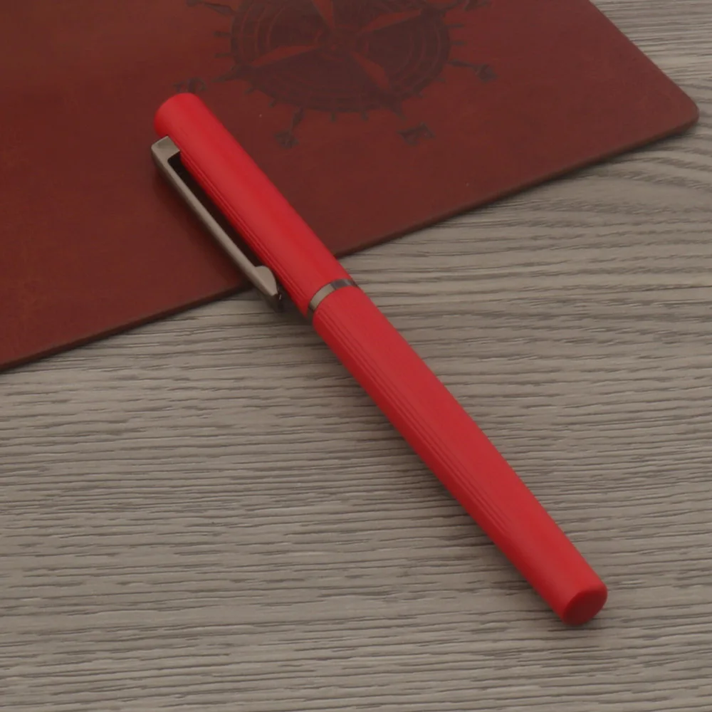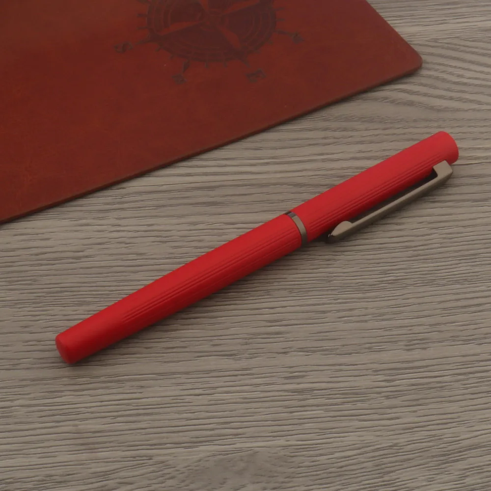 Experience the elegance and precision of this luxury metal fountain pen, perfect for elevating your writing experience. Its vibrant red body, complemented by a textured, ribbed surface, provides both style and a secure grip. The smooth metallic section and shiny silver nib deliver a sophisticated look, making every stroke feel luxurious. Designed with a 0.8mm standard nib, it offers fine, accurate lines ideal for professional or personal writing. The matching cap features a textured pattern and a sleek metallic clip, adding to its refined appearance. This pen is perfect for office use, gifting, or personal collection, combining modern design with high-quality craftsmanship. Imagine yourself writing effortlessly with a pen that exudes confidence and style.