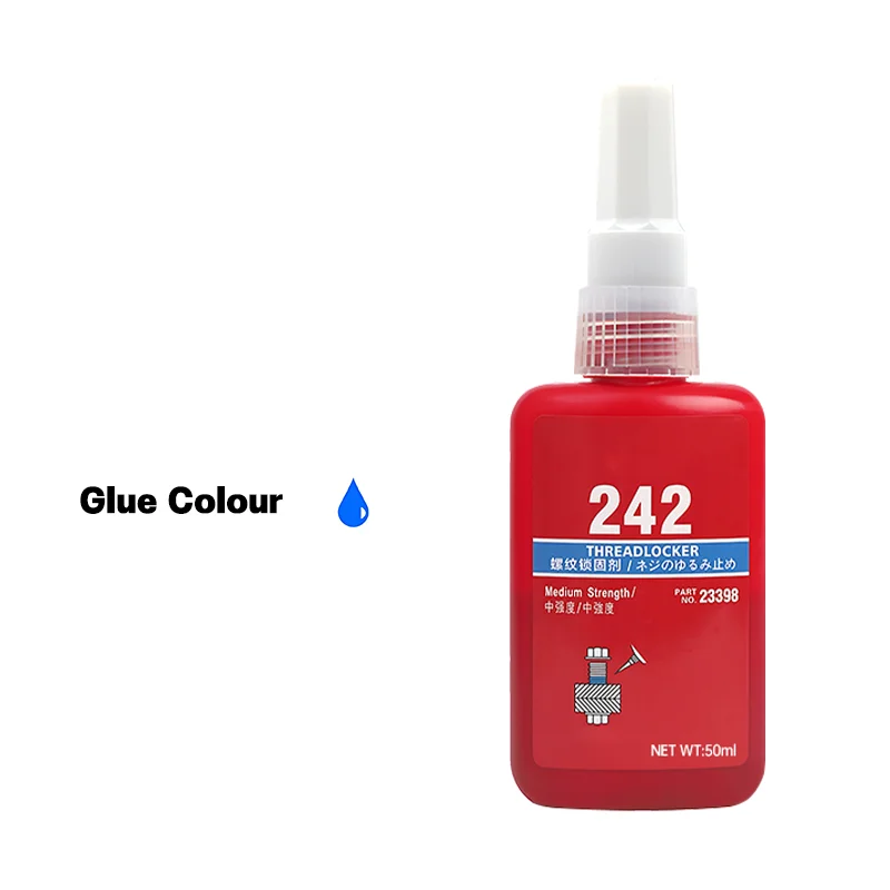 This this 50ml threadlocking adhesive offers a reliable solution for securing metal threaded parts. Its bold red color and smooth, glossy finish make it instantly recognizable, emphasizing its strength and durability. Designed for industrial and mechanical uses, this adhesive provides medium to high strength options, with formulations that resist oil and environmental challenges. Its compact 50ml container is easy to handle, ensuring precise application for locking and sealing threaded components. Whether you need a low-strength, easy-to-disassemble glue or a high-strength, oil-resistant variant, this product adapts to your specific needs. Its simple design emphasizes cleanliness and efficiency, making it ideal for professionals and DIY enthusiasts wanting dependable results. Trusted for its technical robustness, it ensures long-lasting thread integrity in demanding conditions.