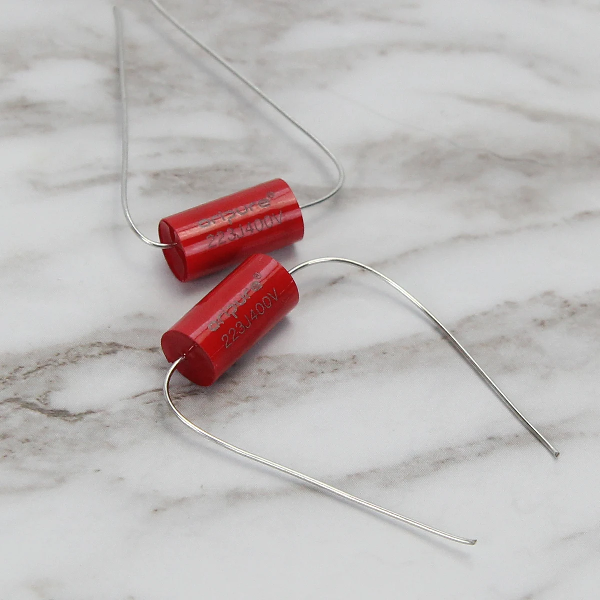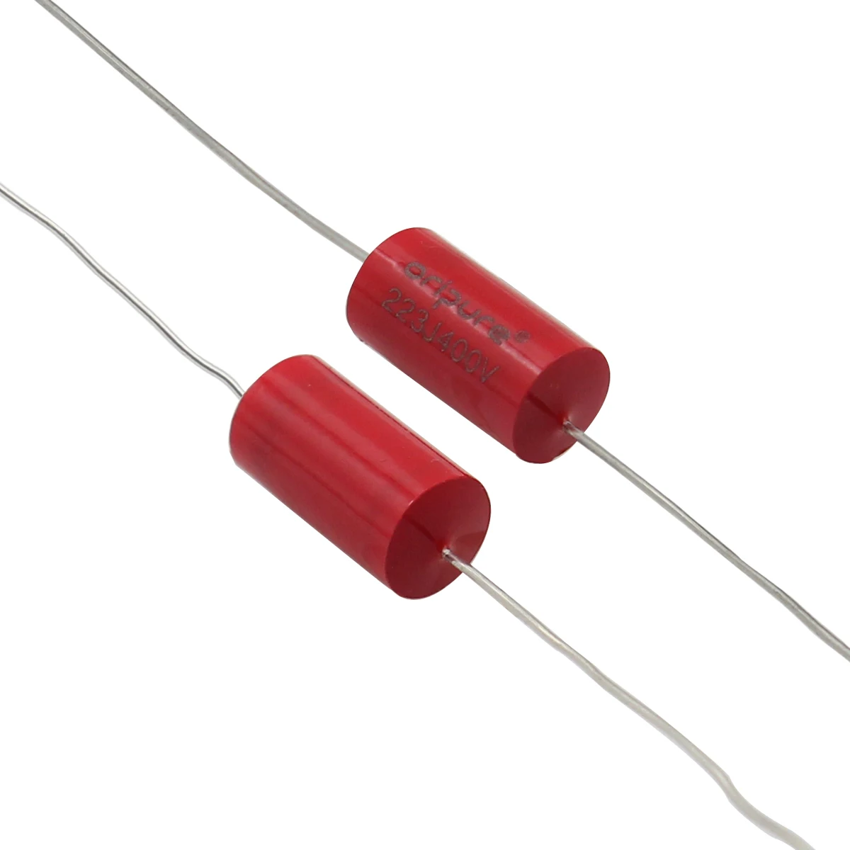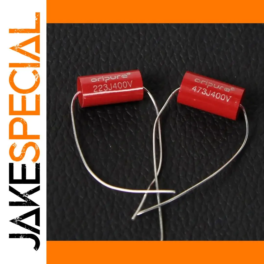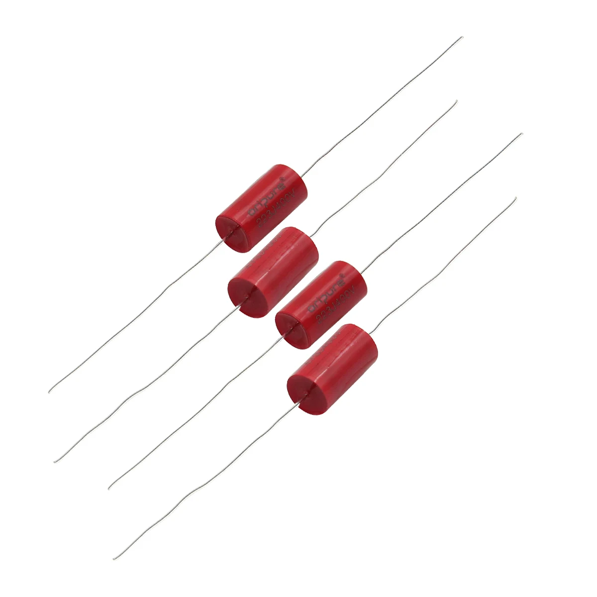 This set of four metallized polyester film capacitors features two capacitance options: 0.022uF and 0.047uF, both rated at 400V with a ±10% tolerance. Designed with a cylindrical shape, the capacitors measure either 5.9mm in diameter and 13mm in length or 7.5mm in diameter and 13mm in length. Constructed with metallized polypropylene film dielectrics, they offer excellent thermal stability from -40°C to +105°C and a low dissipation factor of 0.00025 at 10kHz. With copper leads resistant to rust, these reliable, compact components are ideal for high-density circuit boards, electric guitar pickups, and amplifier applications.
