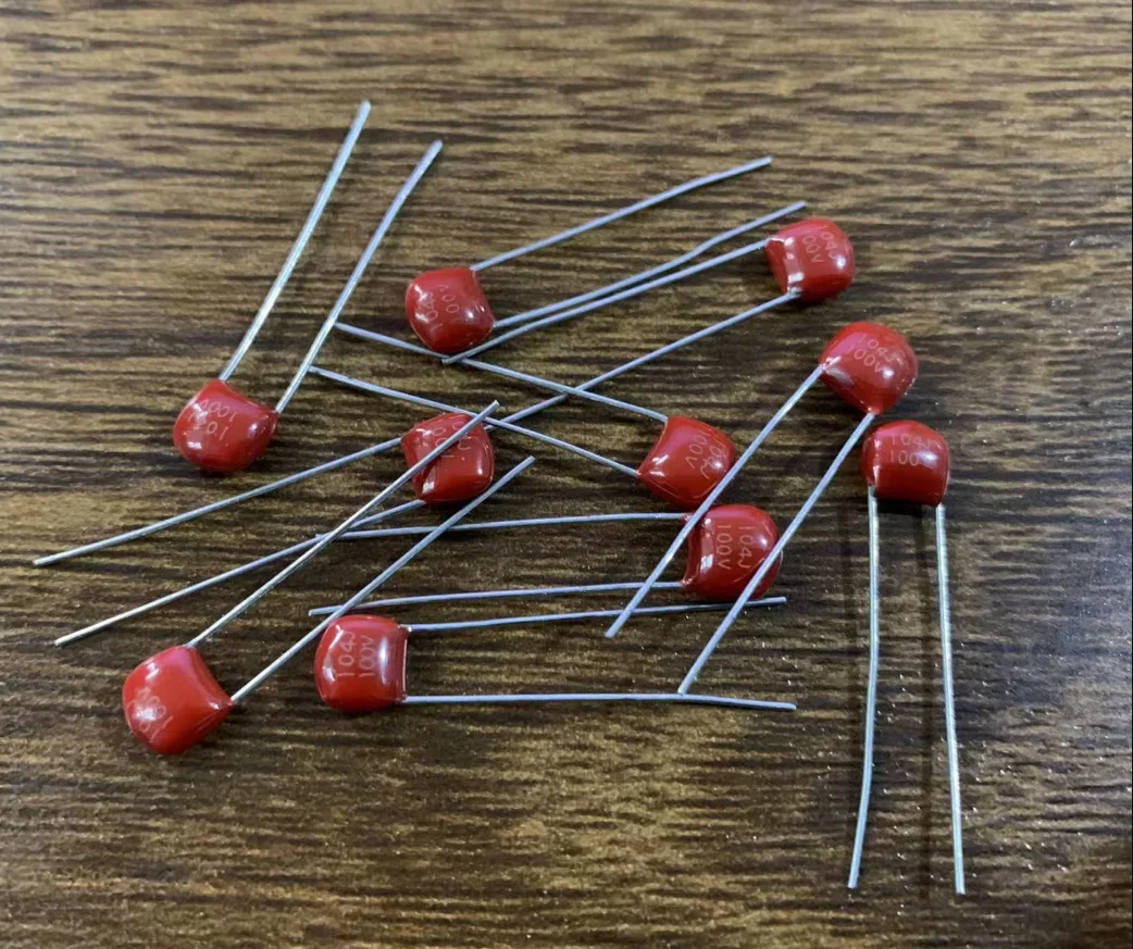 Experience reliable performance with this set of 10 metallized polypropylene capacitors, each with a capacitance of 100nF (104J) and a voltage rating of 100V. These compact, rectangular capacitors feature a glossy red plastic casing with 2-pin metallic leads for easy connection, making them ideal for various electronic applications. Made from high-quality polyester film, they offer durability and precision without added chemicals. Originating from Korea, each capacitor is designed to provide stable, efficient performance in circuit design, ensuring your projects function smoothly and reliably. Perfect for enthusiasts and professionals seeking consistent quality in their electronic components.