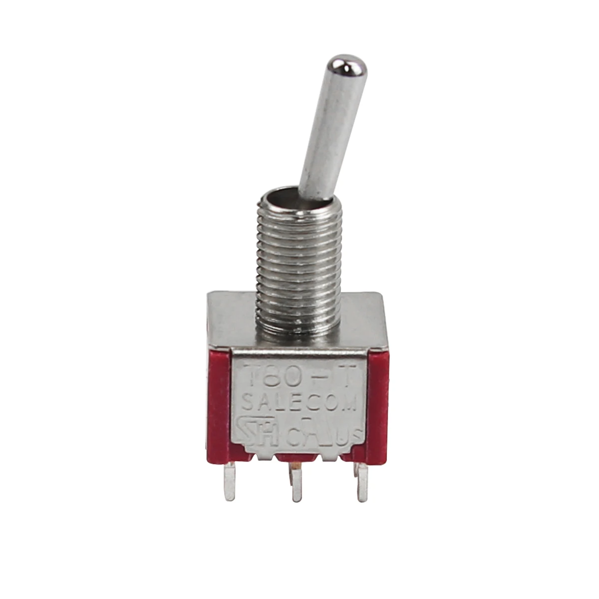 Enhance your guitar or bass projects with this high-quality Mini Guitar Switch. Its striking red color offers an eye-catching accent and easy visibility on your instrument. Designed with a sturdy metal construction, this DPDT toggle switch features two ON-ON positions, providing versatile switching options for your electronics. With six pins, installation is straightforward, ensuring secure and reliable connections. This switch can handle up to 3A at 250V AC and 5A at 125V AC, suitable for low and high voltage applications such as lighting, motors, or tone switching in guitars. The included hex nut, flat washer, and locking washer make mounting a breeze, giving your build a clean, professional look. Its compact design blends functionality with a sleek industrial aesthetic perfect for musical modifications or professional builds.