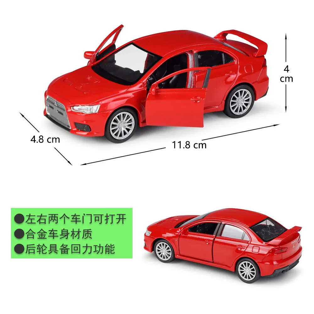 Experience the dynamic style of the 1:36 scale die-cast alloy model of the Lancer Evolution X, measuring approximately 11.8 cm long, 4.8 cm wide, and 4 cm high. This meticulously crafted collectible features opening doors, rotatable wheels, and a rear pull-back mechanism for an engaging display. Made from alloy, rubber, and ABS, it captures the sporty, aggressive aesthetics of the iconic Mitsubishi Lancer Evolution X with sharp lines, detailed vents, a prominent grille, multi-spoke alloy wheels, and a bold rear spoiler. Perfect for collectors and enthusiasts, this static model is ideal for display, gifting, and appreciation.