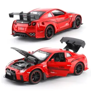 Imagine owning this eye-catching, highly detailed diecast alloy car model that brings the thrill of high-performance vehicles into your collection. Crafted with precision, this 1:32 scale model showcases a vibrant red finish with a glossy, smooth surface that highlights realistic body lines, aerodynamic contours, and bold rear spoilers. Its authentic details include clear headlights, taillights, side mirrors, and front grille, made with high-quality materials to assure durability and visual appeal. The model features functional elements such as openable doors, pull-back motion, built-in lights, and music, creating an interactive experience that feels astonishingly real. Measuring approximately 14.5 cm in length for the GTR R35 and slightly shorter for the GTR R34, this collector's piece will elevate your display or decor with its dynamic, sporty style.