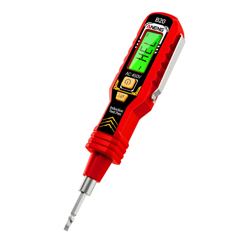 Experience confidence and safety with this sleek, cordless, red-colored voltage tester pen. Designed with a slim, elongated silhouette, it combines modern aesthetics with practical functionality. The digitally backlit LCD display features dual-color indicators—red for high voltage and green for low voltage—giving you clear, instant readings. The device’s black, yellow-striped directional design emphasizes precise testing, while the shiny chrome vanadium steel double-head screwdriver attached at the bottom adds industrial durability. Its streamlined shape fits comfortably in your hand, making troubleshooting electrical systems straightforward. Whether checking live wires or identifying zero wires, this tool delivers accurate results quickly, backed by advanced features such as automatic shutdown, buzzer alarms, and durable construction from TPE and chrome vanadium steel. Elevate your electrical diagnostics with this professional-grade tester.