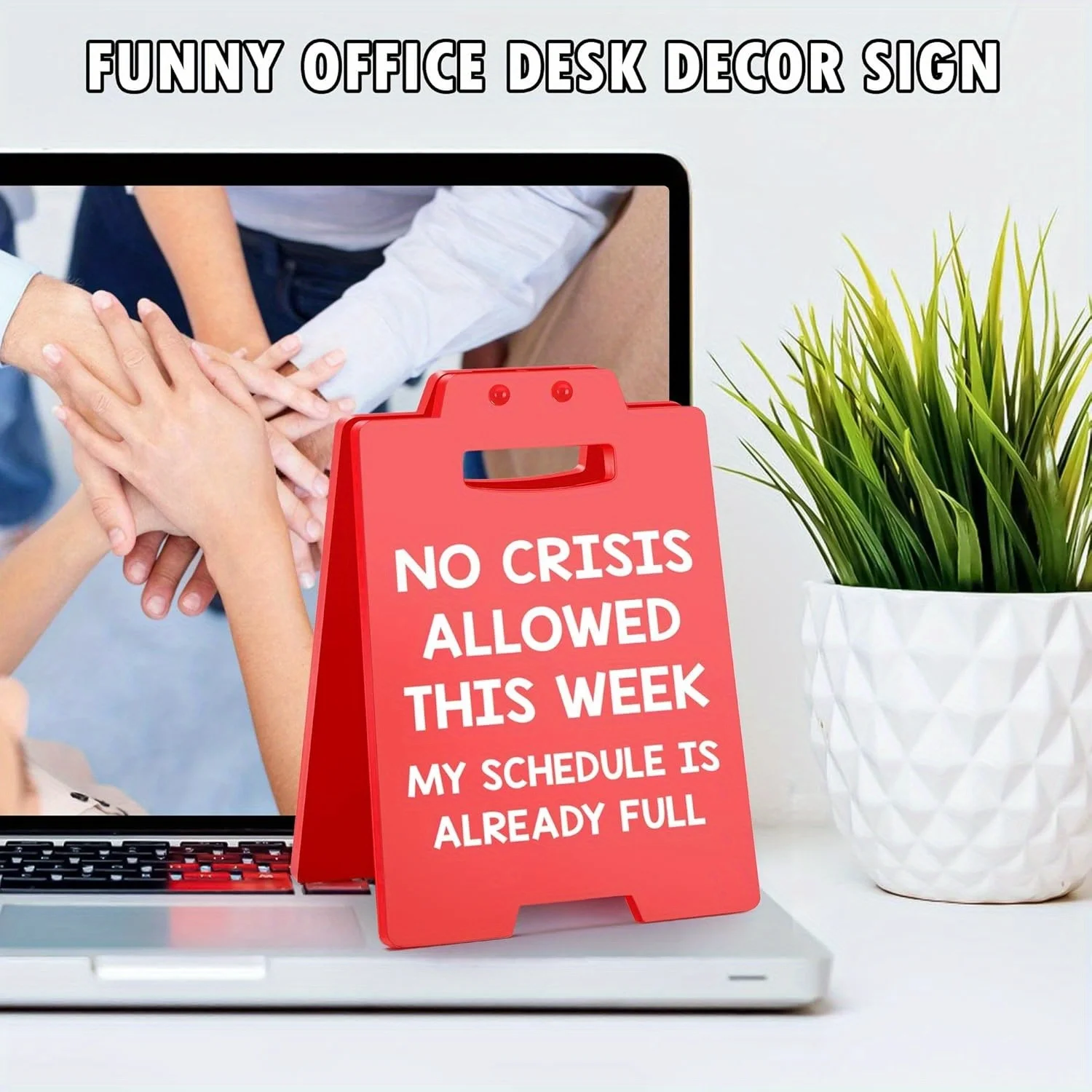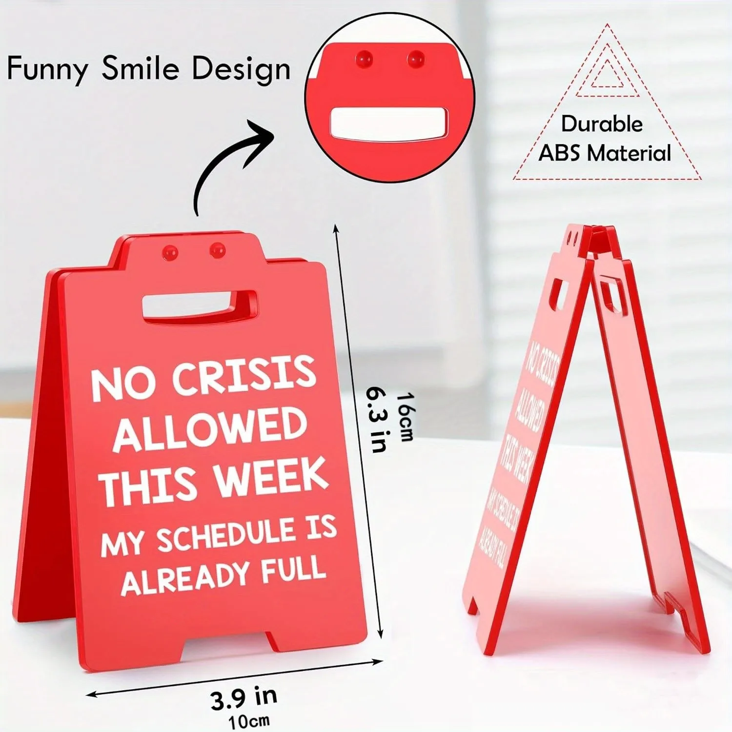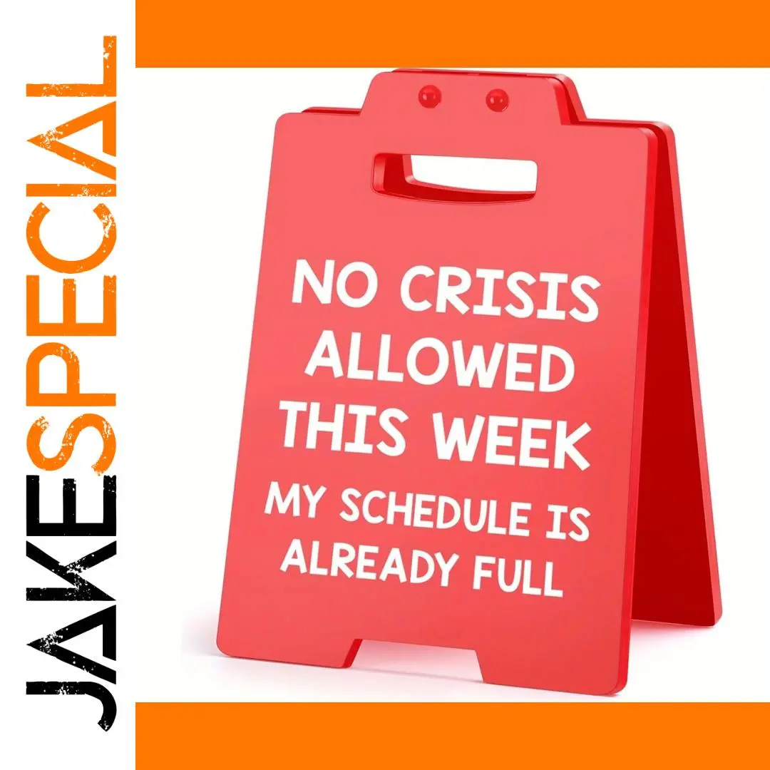 Imagine adding a touch of humor and personality to your office environment with this vibrant red plastic desk sign. Its playful design features a sturdy A-frame structure with a smooth, glossy finish that amplifies its bold color and cheerful aesthetic. The rectangular shape with rounded edges combines style and approachability, making it perfect for managers, supervisors, leaders, or anyone wanting to lighten the mood. The built-in handle at the top allows easy movement or placement, ensuring it fits seamlessly into any workspace. The humorous message, “NO CRISIS ALLOWED THIS WEEK MY SCHEDULE IS ALREADY FULL,” is printed in bold white capital letters, offering a fun way to communicate busy yet approachable leadership. Its cheerful design makes it an ideal gift for Boss's Day or a delightful addition to your office decor.