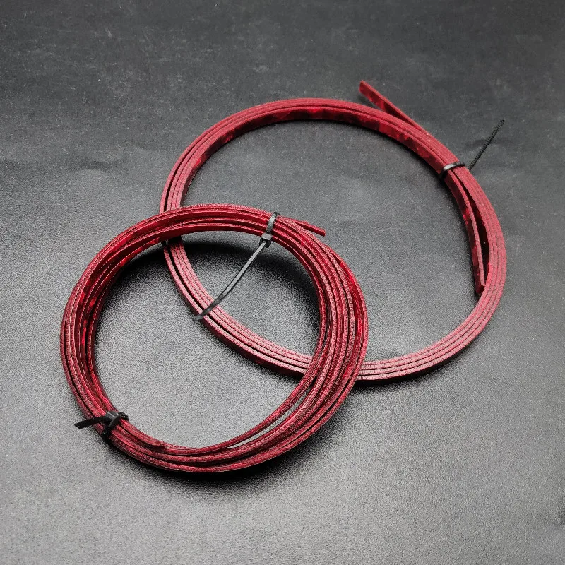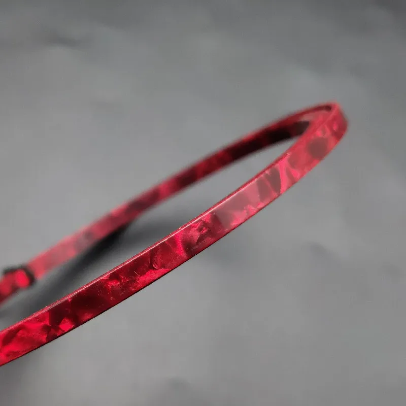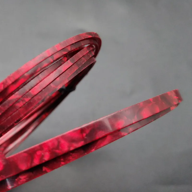 Enhance your guitar with this set of 10 high-quality celluloid binding strips in vibrant red pearl. Each strip measures approximately 1650 mm in length with widths of 6 mm, 5 mm, 4 mm, and 2 mm, and a thickness of 1.5 mm, offering versatile decoration for acoustic and classical guitars. Their glossy, iridescent finish mimics real pearl, providing a sleek, elegant aesthetic while protecting guitar edges. Lightweight at about 30 grams per piece, these durable strips are perfect for detailed finishing work, adding a refined, high-gloss accent to your instrument. Crafted to meet quality standards, they are an excellent choice for vintage, custom, or professional guitar projects.