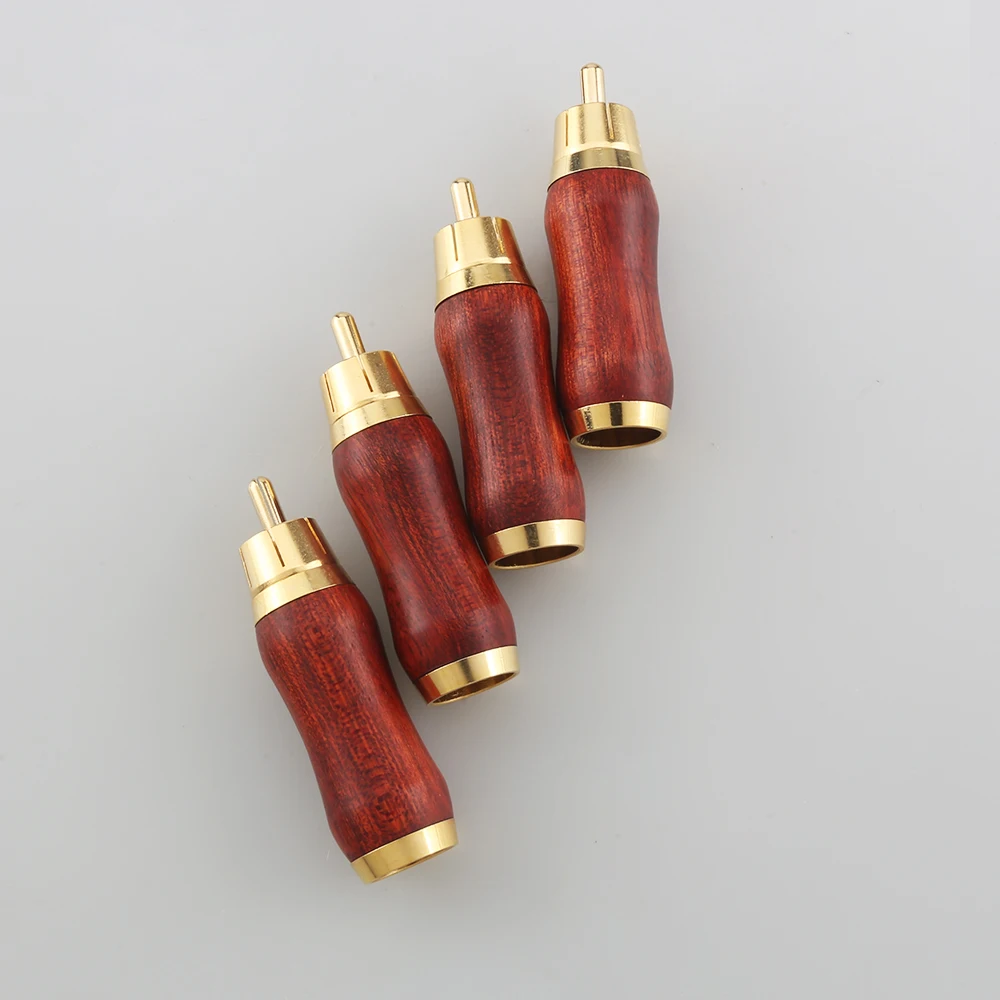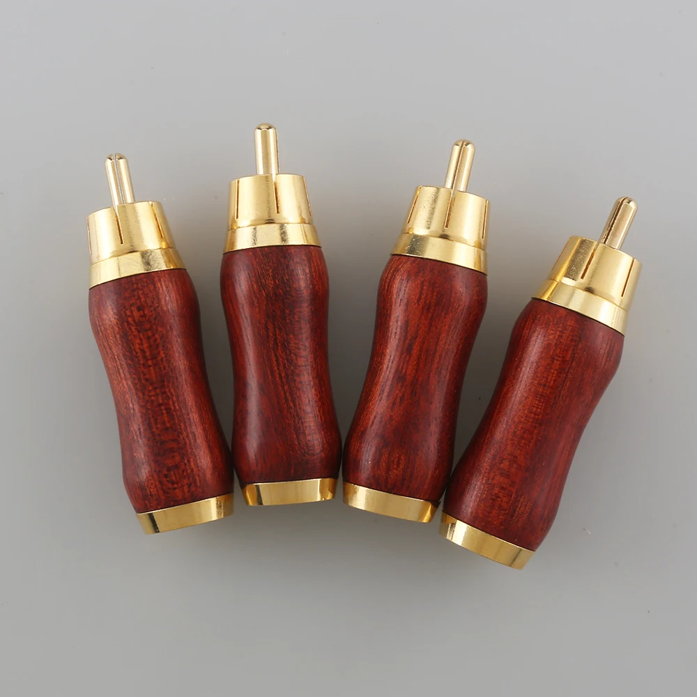 Elevate your audio setup with this set of four high-end RCA male connectors, featuring 3μ gold-plated brass conductors and polished red sandalwood shells with a waxed, high-polish finish. Each connector measures 15mm in diameter and 51.5mm in length, suitable for wires up to 11mm in diameter. Designed for durability and superior sound quality, they include soldered cable connections and crimped cable holders. These premium connectors combine natural elegance with metallic precision, ensuring a reliable, high-performance connection for high-end audio equipment. Ideal for enthusiasts who value both aesthetics and exceptional audio fidelity.