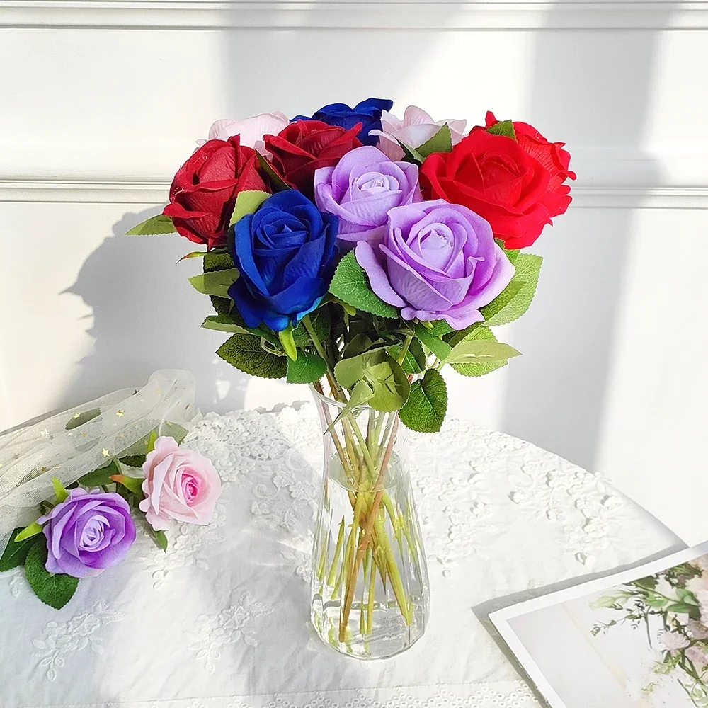 Enhance your special occasions with this realistic artificial flower bouquet featuring 1, 3, or 5 vibrant silk roses crafted from soft non-woven fabric. Each rose has a diameter of approximately 8-10 cm, a height of about 8 cm, and when arranged, the bouquet measures roughly 50 cm in length. Available in a variety of colors including Black, Blue, Light Pink, Pink, Purple, Red, White, Wine Red, and Yellow, these elegant flowers are perfect for wedding decor, DIY bridal bouquets, home and garden decoration, table settings, and festive gifts. The stems are flexible and can be shaped to suit your aesthetic, providing a beautiful, lifelike touch for any setting.