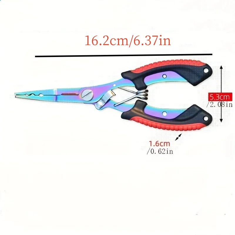Experience the perfect blend of style and functionality with this multi-functional fishing pliers. Crafted from durable stainless steel, it features an eye-catching iridescent finish that shifts colors from blue to purple and green under light, giving it a sleek, modern look. The handles are coated with bold red and black rubber grips, ensuring a comfortable, slip-resistant hold during use. This compact, versatile tool is designed for a variety of fishing tasks, including opening split rings, cutting lines, removing hooks, crimping sleeves, and cutting hard wires. Its high-quality construction guarantees durability and precision, making it an essential companion for serious anglers and fishing enthusiasts alike.