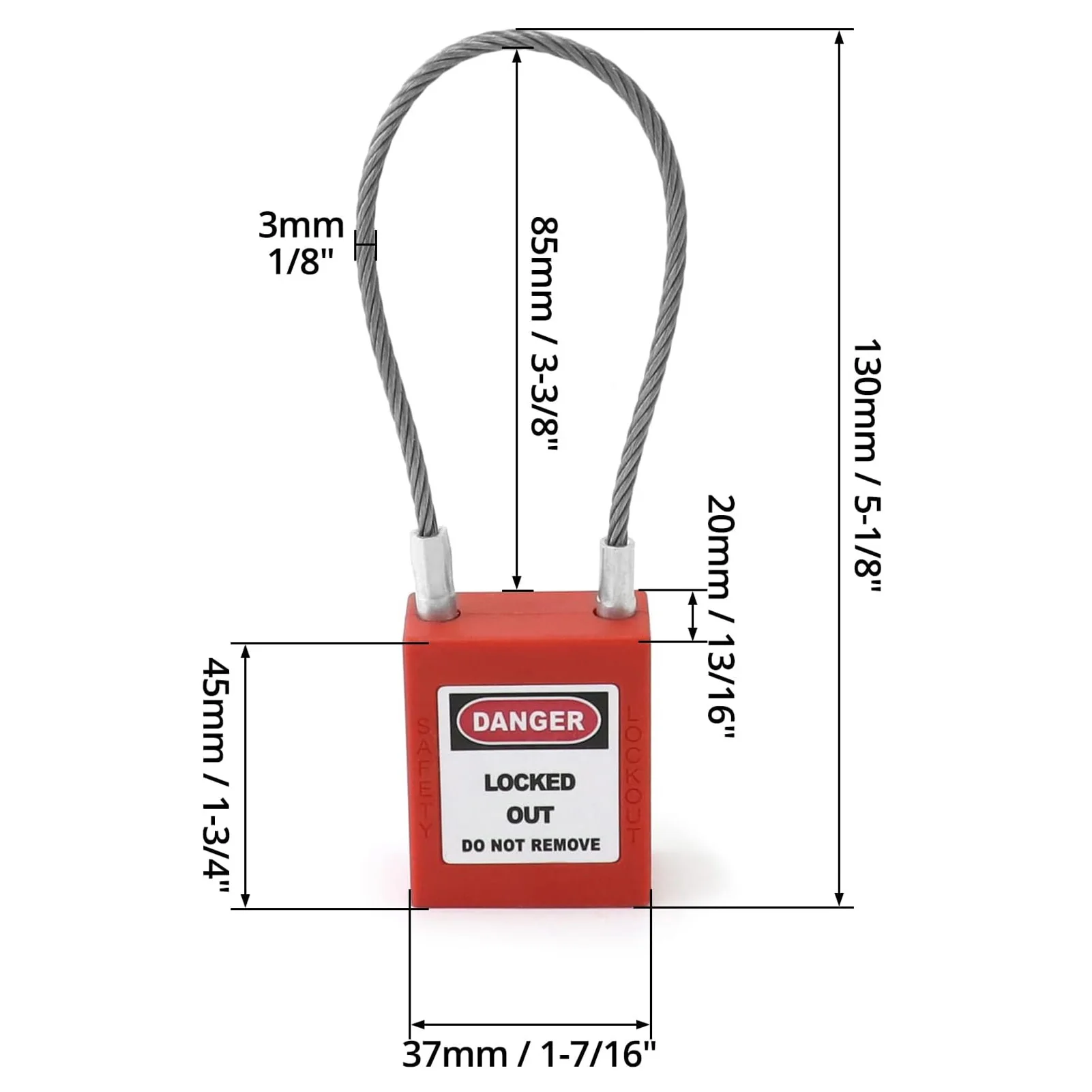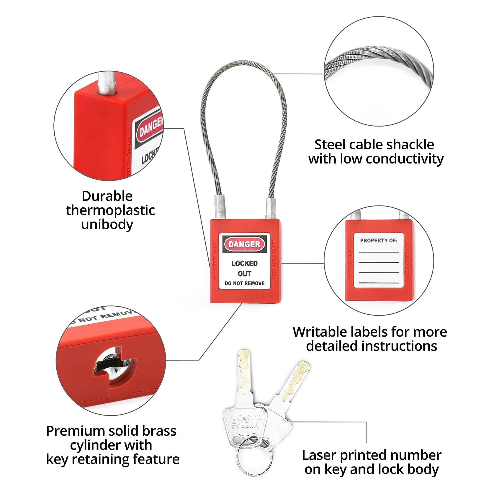 This stainless steel cable lockout tagout lock features a high-strength, durable stainless steel cable and a nylon-reinforced, UV-resistant, corrosion-resistant lock case suitable for long-term industrial use. The compact, streamlined design includes a keyed padlock with 12 internal cylinders for enhanced security, reducing duplicate key risks. Operating between -57°C and 177°C, it ensures safety during equipment locking and energy isolation procedures. The lock’s anti-slip pattern provides comfortable operation, while its internal structure prevents key removal when open, ensuring reliable security. Perfect for industrial safety applications, this lock combines robustness, durability, and ease of use in a professional safety environment.