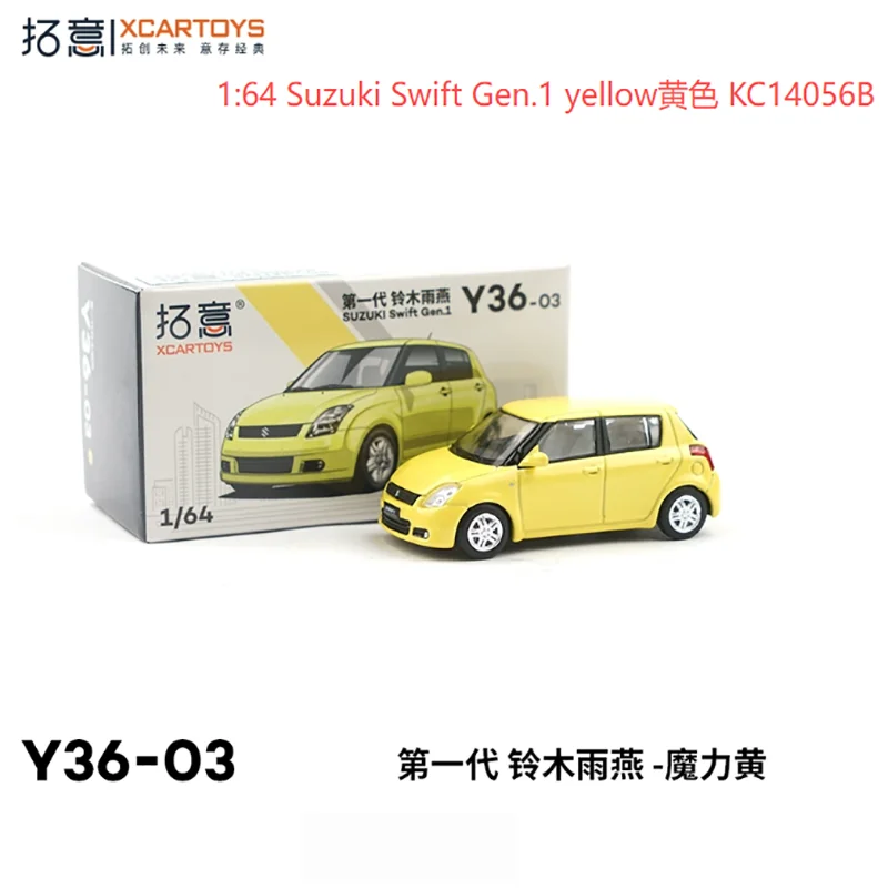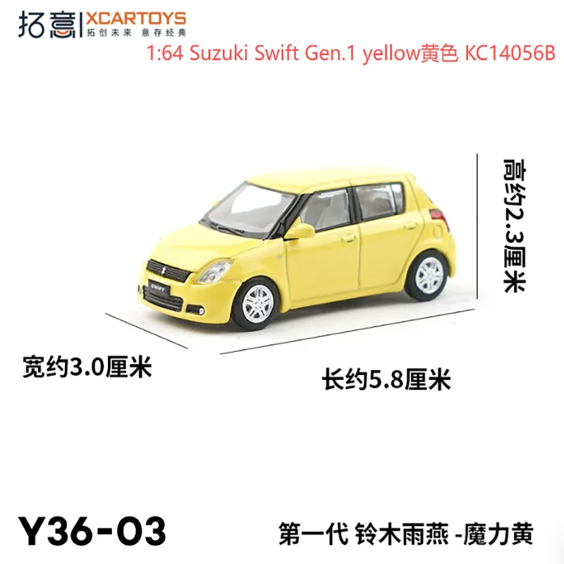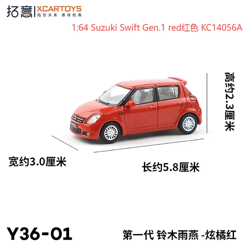Capture the essence of a sleek, dynamic vehicle with this 1:64 scale alloy model of the Suzuki Swift Gen.1. Crafted from metal, this collectible diecast car features a vibrant red body with a contrasting black roof, glossy finish, and detailed accents including silver wheel rims, clear windows with black trim, and finely crafted lines that depict doors, mirrors, and panel details. Available in three colors, designated as B, A, and C, it offers a realistic and stylish representation of the original car. Perfect for adult collectors, it is non-motorized and designed solely for display and admiration, emphasizing craftsmanship and aesthetic appeal.