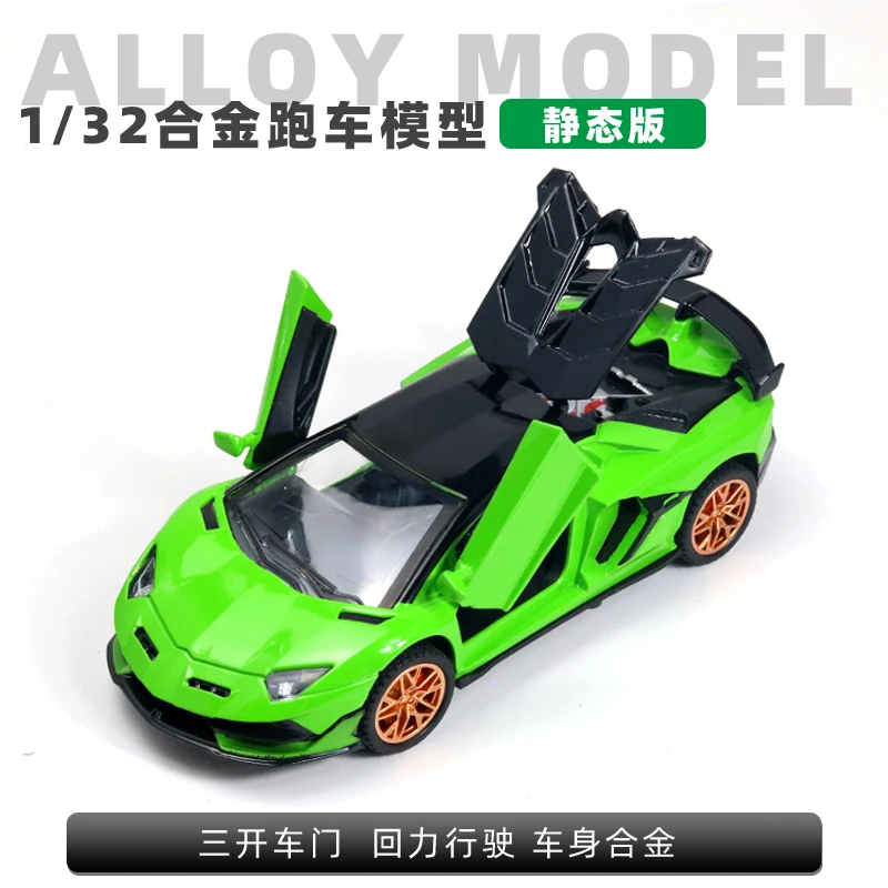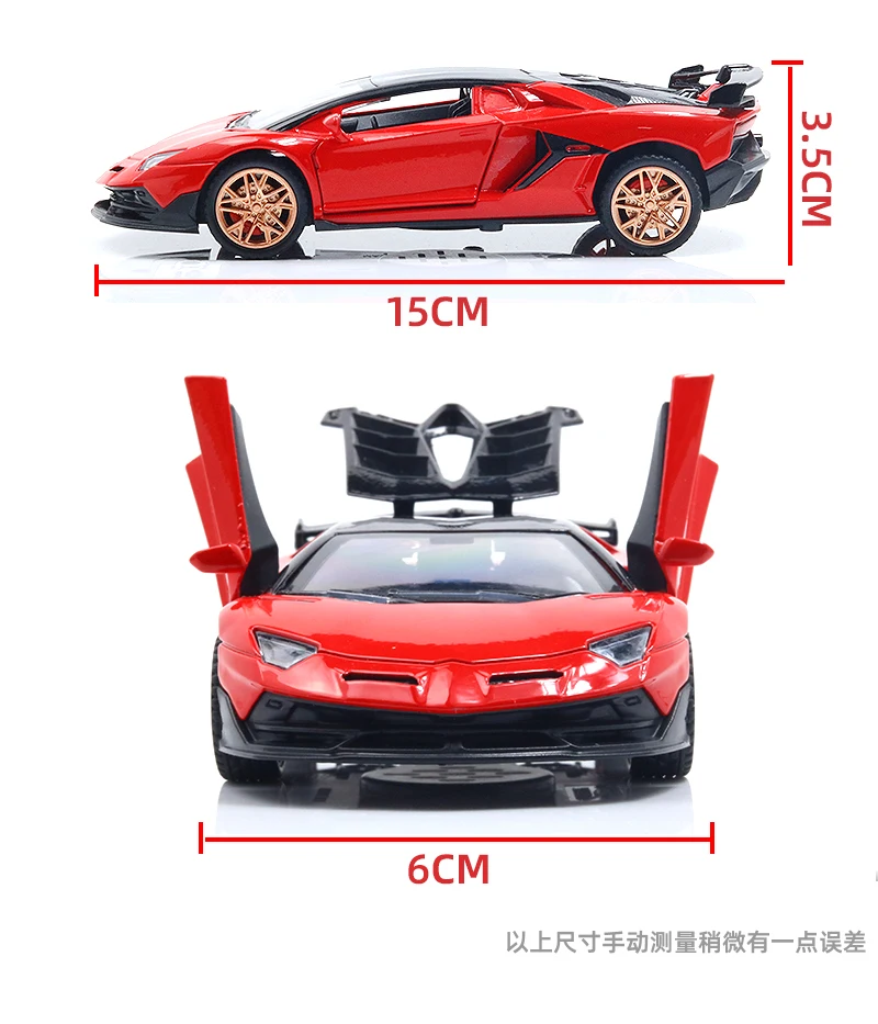 Experience the thrill of high-speed racing with this stunning 1:32 scale die-cast alloy race car, designed to resemble an SVJ-style Lamborghini. Its sleek, aerodynamic body features sharp, angular lines and a low profile that exudes modern performance and style. Crafted from durable metal, this model offers a solid, realistic weight that enhances its premium feel. The vibrant red finish highlights its aggressive stance, while detailed accents like side air intakes and a rear wing add authenticity. With functional doors that open smoothly, this toy is perfect for energetic children and passionate collectors alike. It’s a compact, eye-catching display piece capable of capturing the imagination and admiration of all who see it.