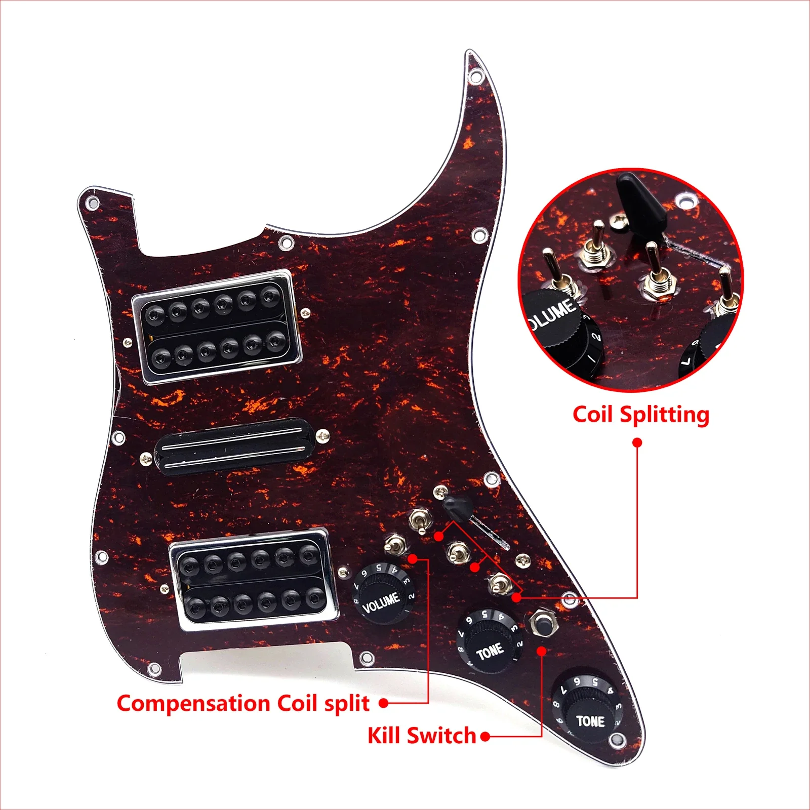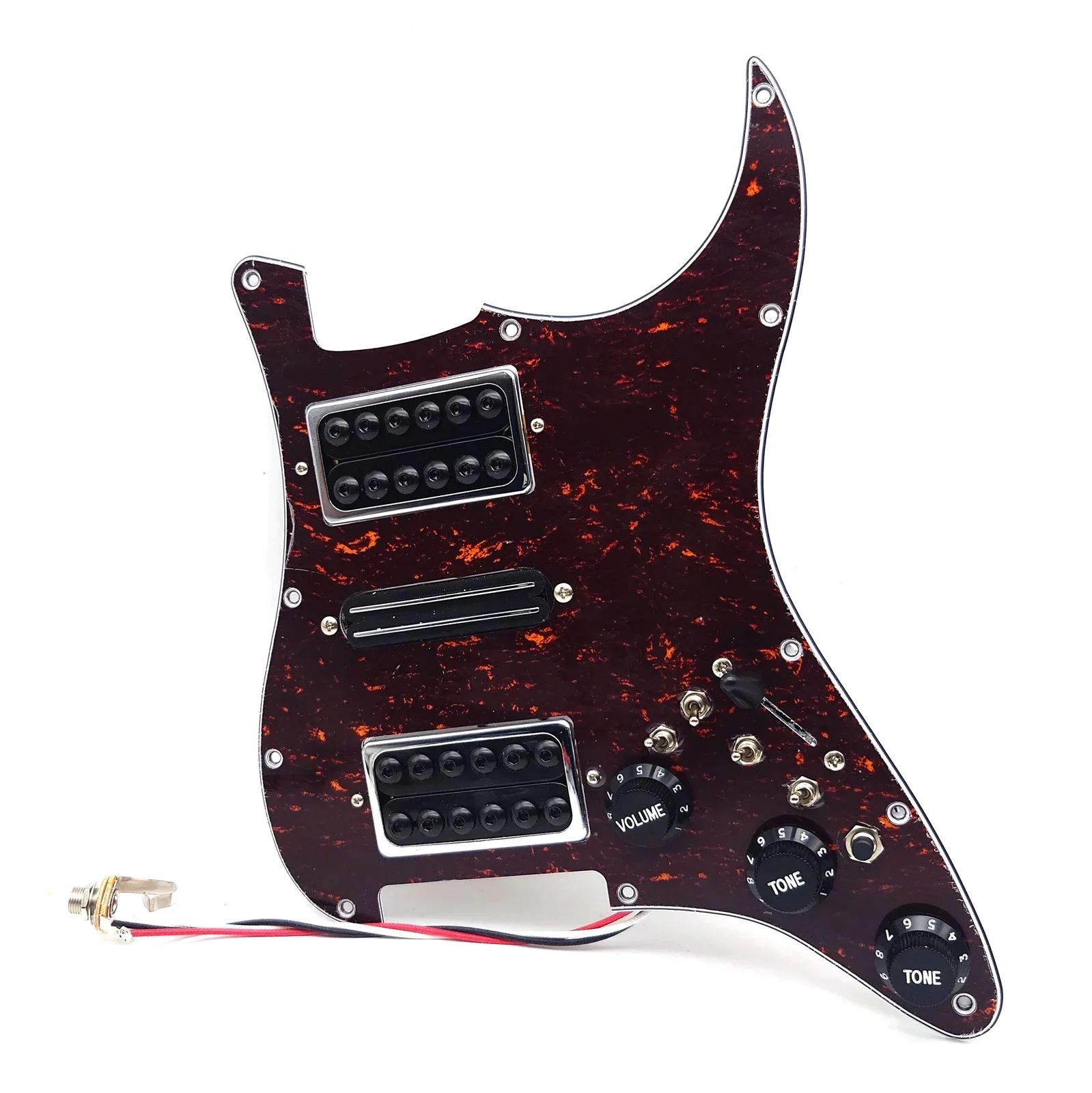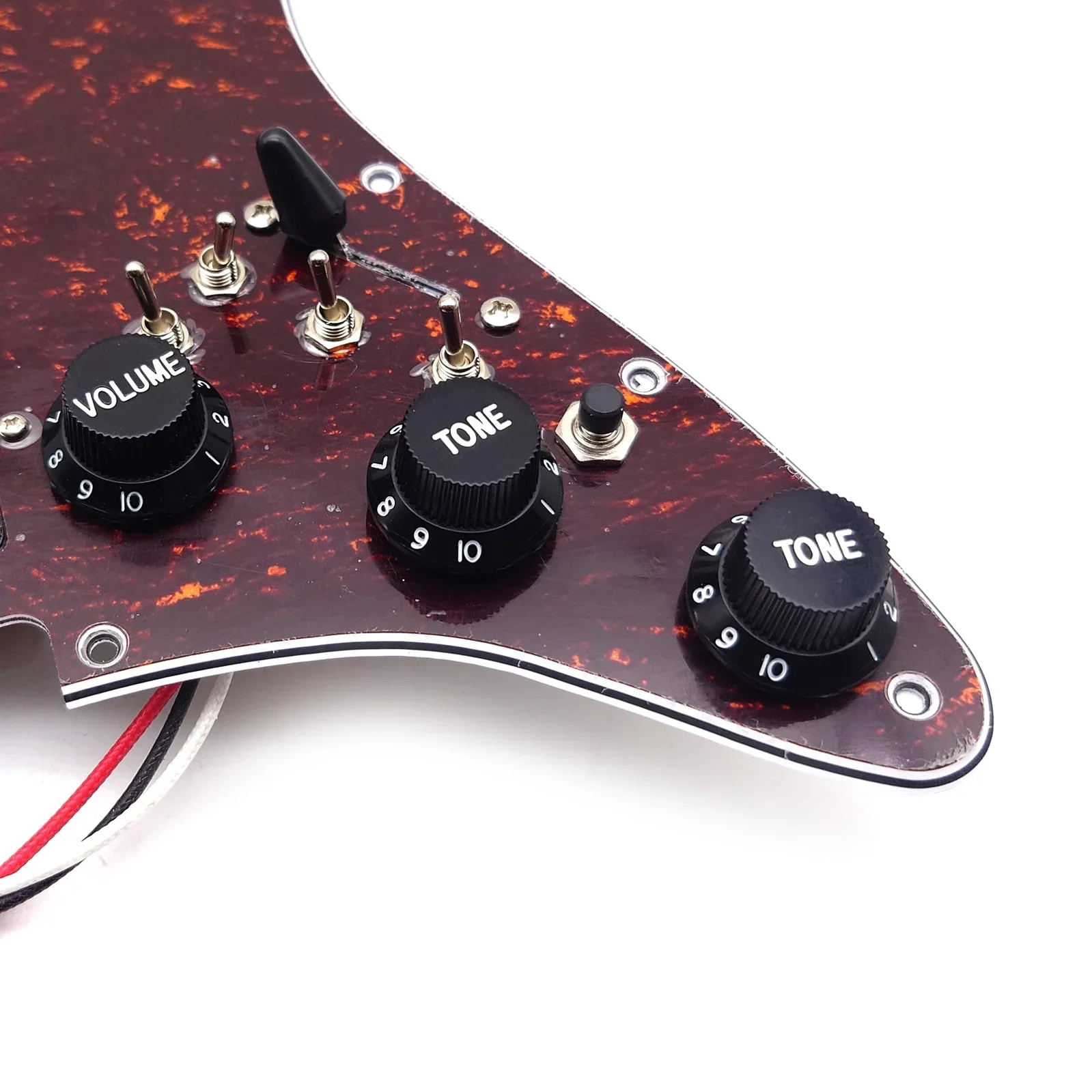 Experience the perfect blend of aesthetic appeal and versatile functionality with this prewired loaded pickguard, designed for electric guitars. Its striking red tortoise shell finish offers a bold, vintage-inspired look enhanced by glossy surface details. Crafted from durable metal, plastic, copper, and magnets, it features an intricate cutout design and multiple control options, including coil splitting and kill switch functionality. Ideal for right-handed players, this pickguard includes precisely matched components such as Invader humbuckers, a mini humbucker, and a single coil, all wired to enable multiple tonal configurations. The comprehensive set ensures seamless installation, allowing you to elevate your playing experience with personalized sound options and a visually stunning appearance.