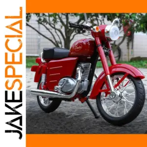 Enhance your collection with this detailed 1/10 scale diecast motorcycle model, crafted from alloy and plastic, featuring realistic sound and light effects for an immersive display or play experience. The vibrant red vintage-inspired design showcases a glossy finish, a rounded fuel tank with nostalgic script logo, chrome accents, a prominent headlight encased in a metallic bezel, black handlebars, and detailed engine components painted in metallic silver. The black textured seat and carefully crafted suspension and fenders complete the authentic look, making it the perfect gift or display piece for motorcycle enthusiasts and collectors who appreciate fine craftsmanship and nostalgic style.
